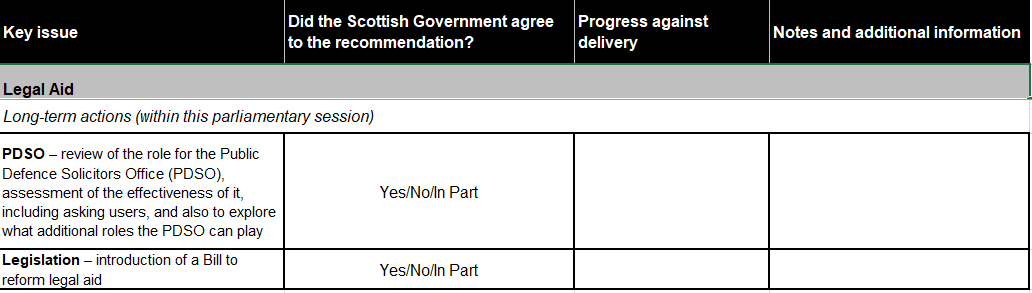 Conclusion: It has almost been four years since the publication of the report of the Independent Review of Legal Aid chaired by Martyn Evans. We are disappointed that since then only limited progress appears to have been made in reforming legal aid. The Scottish Government’s position, as set out in the Programme for Government, is that it will conduct further engagement in order “to review the legal aid system”. A legal aid bill is due to be brought forward this parliamentary session. However a date for the introduction of the bill has not yet been announced. It seems likely that it will not be introduced until after the engagement planned by the Scottish Government has concluded.