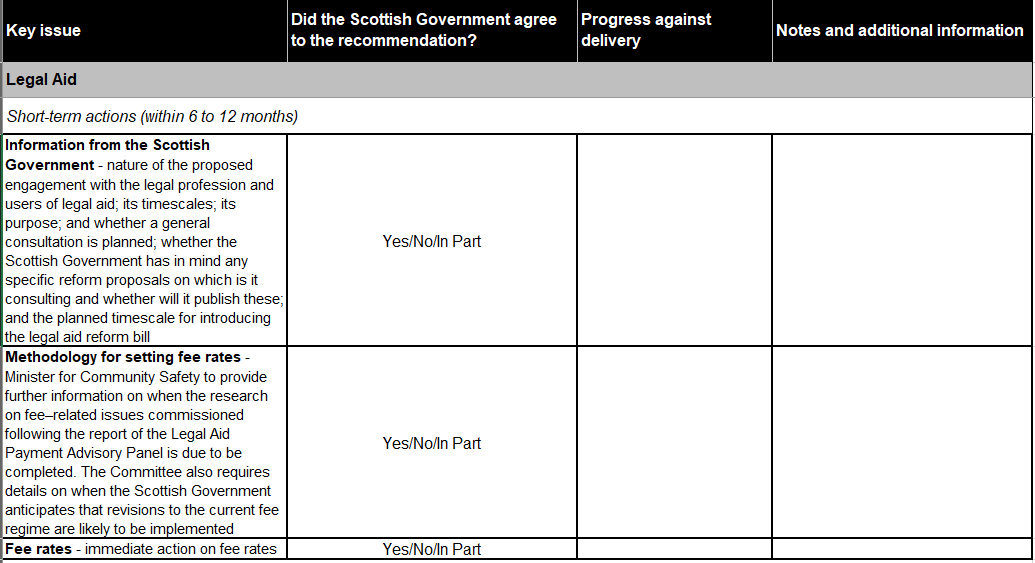 In September 2021, the Scottish Government responded to the report of the Legal Aid Payment Advisory Panel. The Scottish Government accepted the recommendation that more research was needed and indicated that it will now begin the process of commissioning that research.