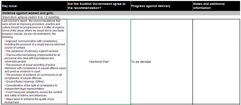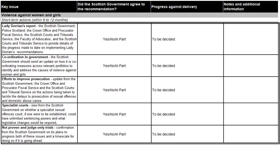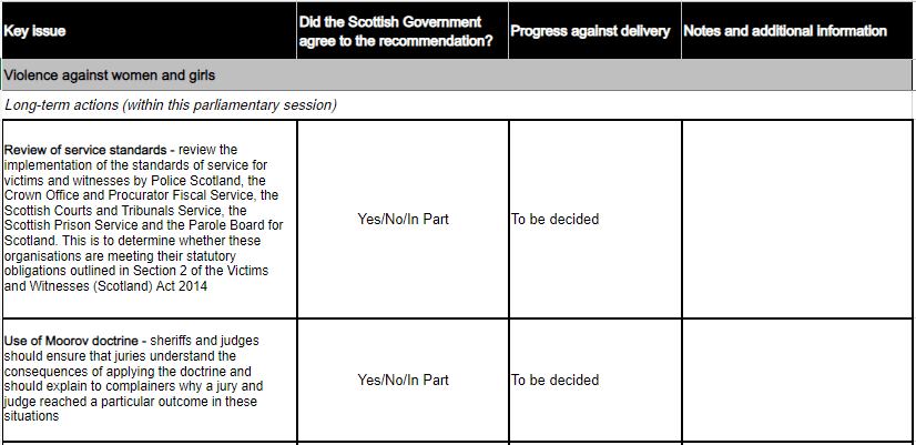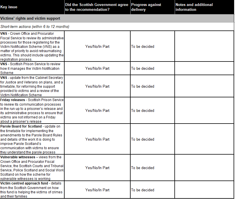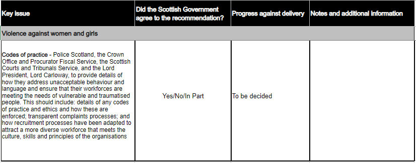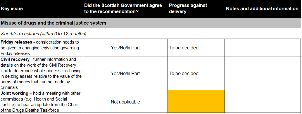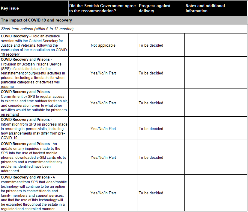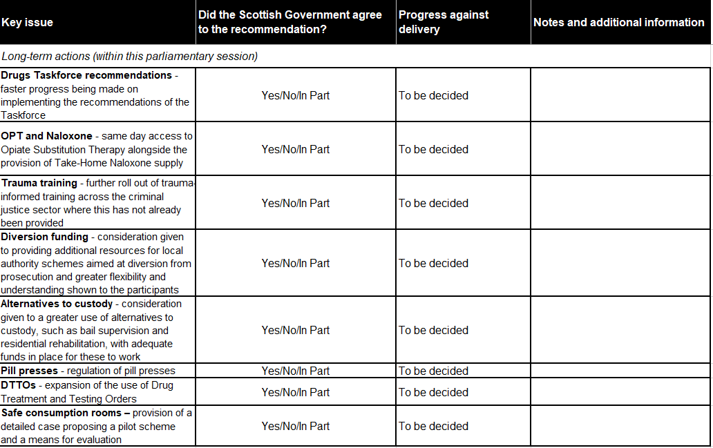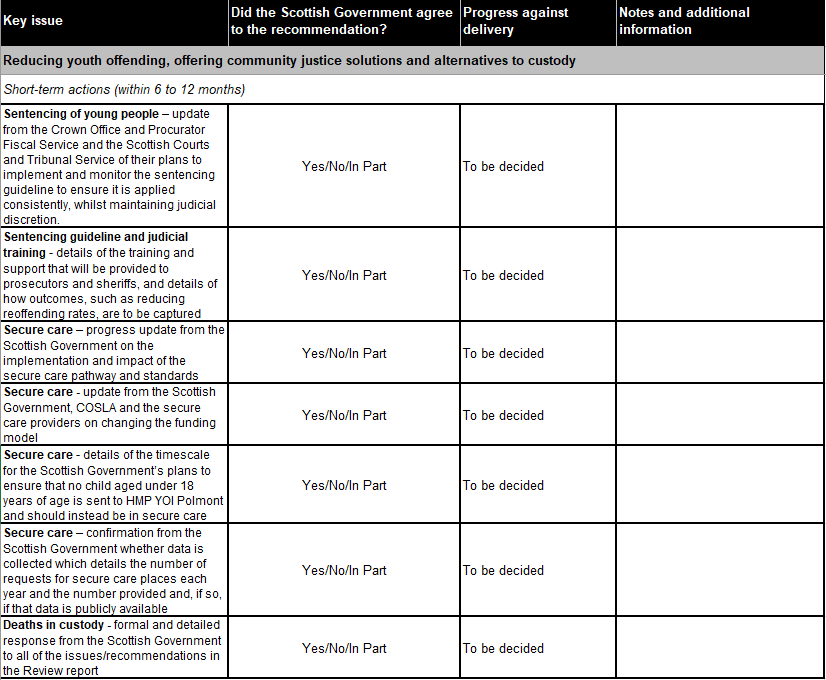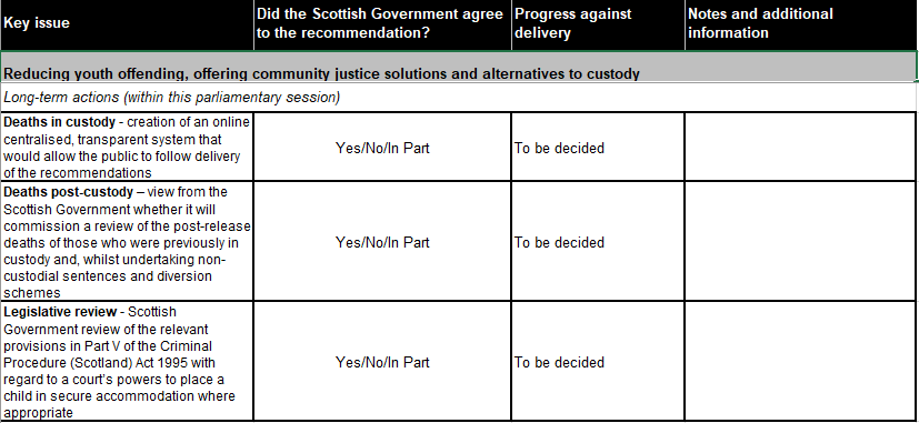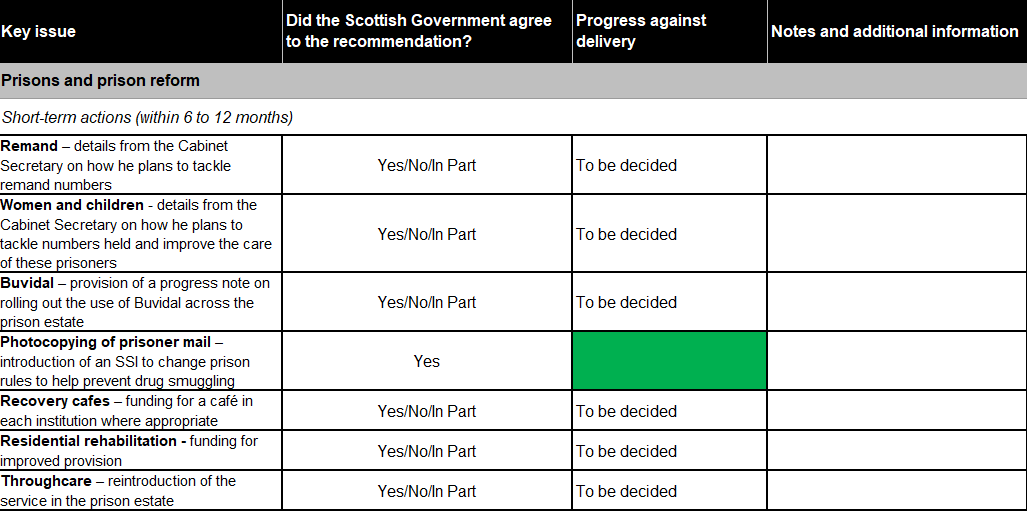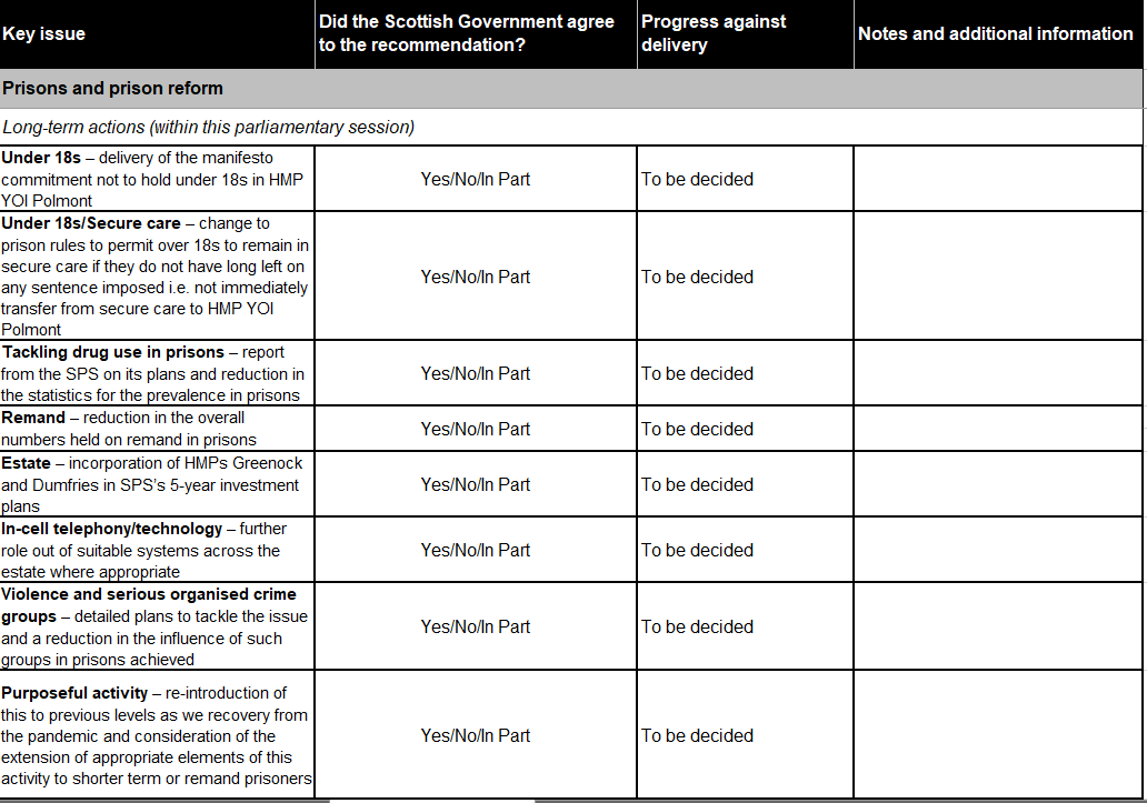 Recommendation: The Committee also requests a formal and detailed response from the Scottish Government to all of the issues/recommendations in the report of the Independent Review of the Response to Deaths in Prison Custody. The Committee requests the Government be clear as to whether each recommendation is accepted and the timescales for delivery. We also recommend the creation of an online centralised, transparent system that would allow the public to follow delivery of the recommendations. In any case, the Committee will keep this issue under review.