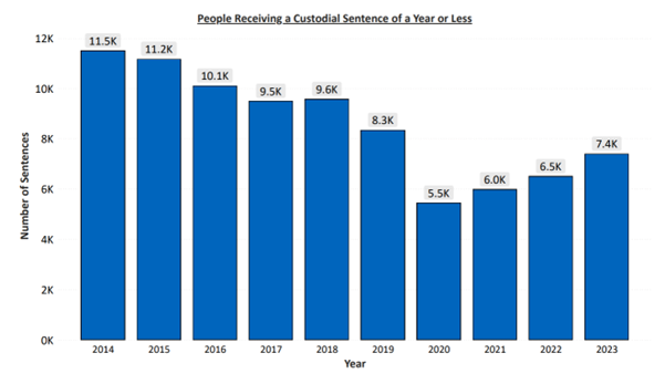 In Annex A, Table 1 shows the number of people receiving a custodial sentence of one year or less from 2013 to 2023 and Table 2 shows a breakdown by year of people receiving short term sentences.