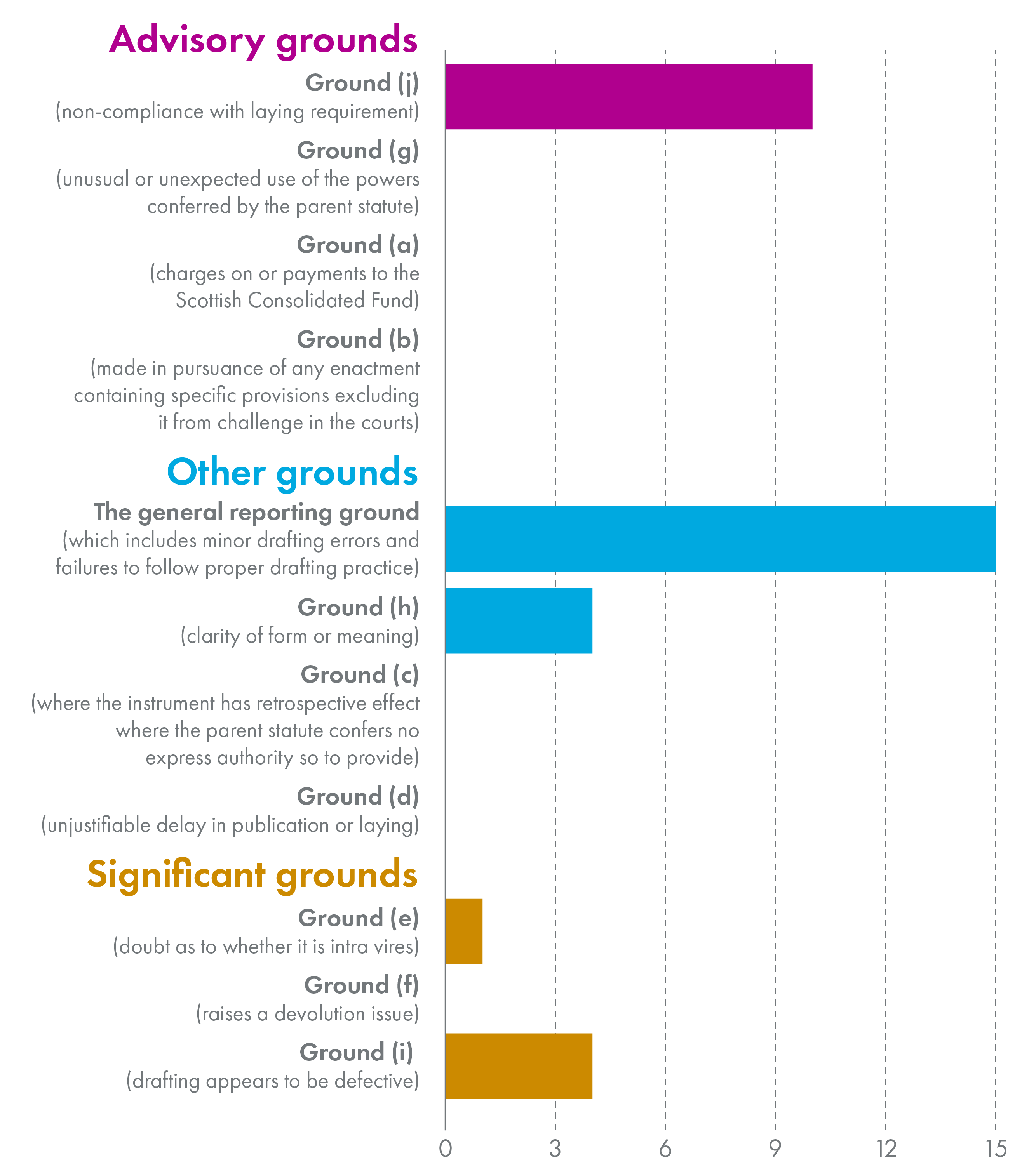 “Significant grounds” represent those areas which would cause the Committee most concern; “Other grounds” consist of areas where that concern would not be so significant, but nonetheless the matters can affect the understanding of an instrument if not its validity; “Advisory grounds” meanwhile relate to matters which the Committee wishes to draw to the attention of the Parliament or lead committee but do not affect the understanding of an instrument. The individual reporting grounds are broken down by their hierarchy below.