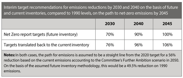 The approach to accounting for emissions and the way in which emissions from peatland are calculated is currently being revised by the IPCC. The methodology for calculating and including these in GHG inventories will change before 2022. The way that the UK Government decides to include peatland will affect the feasibility of achieving net-zero by 2045. Once included in the inventory, it is thought that this will add up to 9.7 MtCO2e to estimates of Scottish emissionsi, both for the present day and back to 1990. The CCC wrote to the Committee on 20 Mayii, providing additional information on interim targets for Scotland. They confirmed that their recommended interim targets are based on “future methods of accounting” i.e. they have taken into account the expected future changes to peatland methodology. The CCC’s letter included the following table comparing targets, depending on which inventory is used.