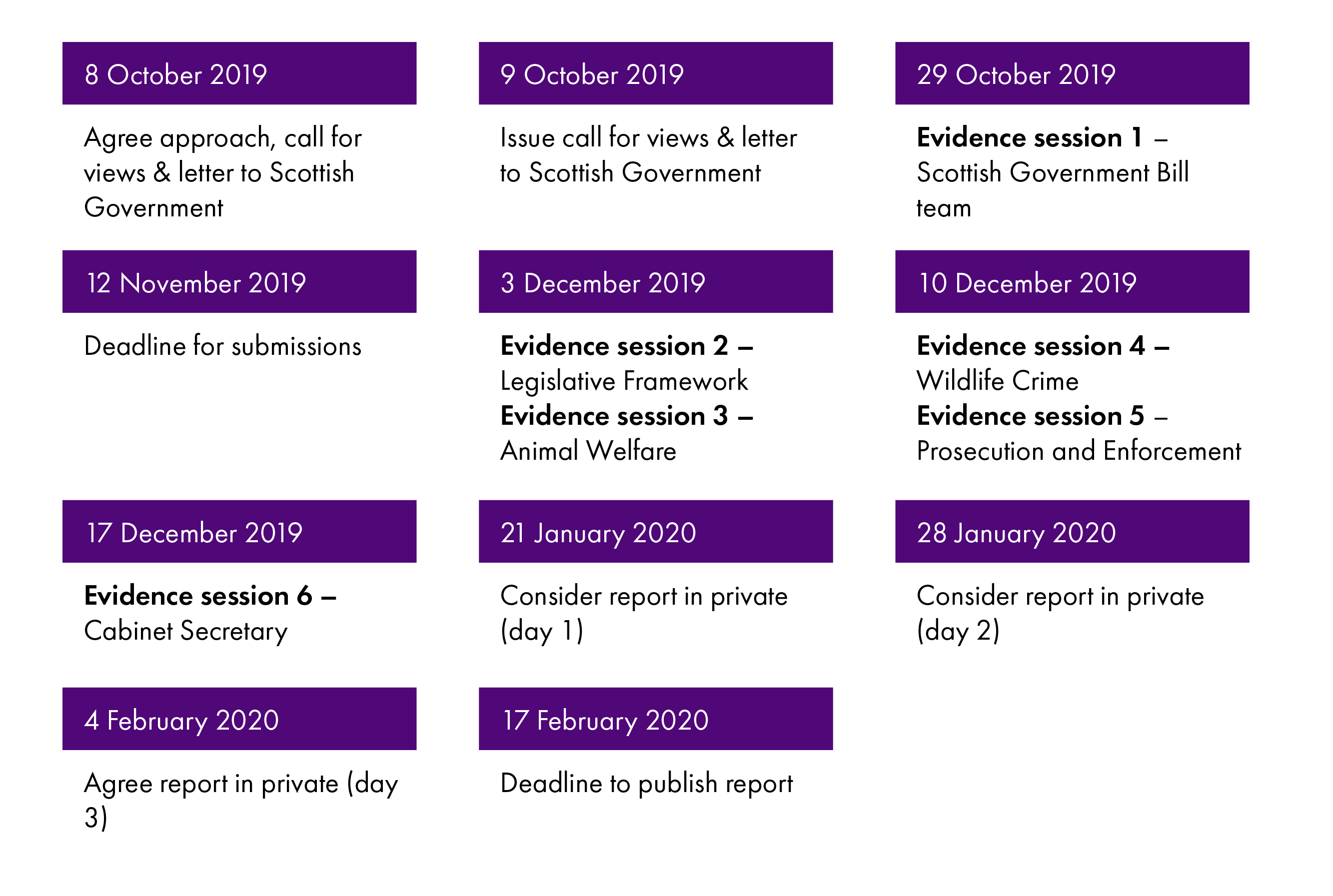 The Committee considered its approach to scrutiny at Stage 1 of the Bill on 8 October 2019. The Committee agreed to launch a call for views and to hold five evidence sessions over three meetings with the Scottish Government Bill team and stakeholders on key areas of the Bill before hearing from the Cabinet Secretary on 17 December 2019.
