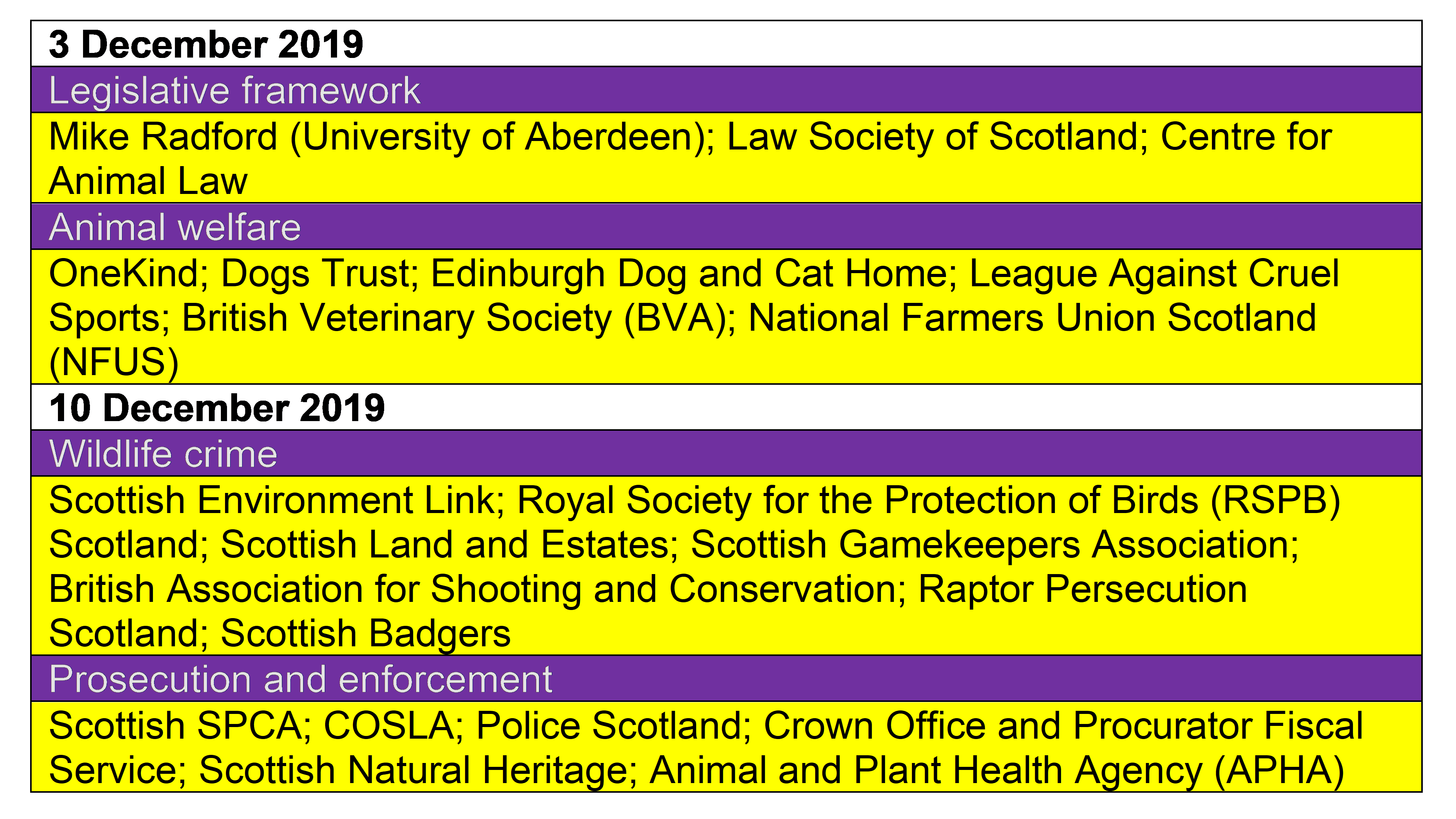 Mike Radford, Reader, University of Aberdeen; Gillian Mawdsley, Secretary, Criminal Law Committee, Law Society of Scotland; Scott Blair, Advocate, Centre for Animal Law; Libby Anderson, Policy Advisor, OneKind; Runa Hanaghan, Deputy Veterinary Director, Dogs Trust; Howard Bridges, Chief Executive Officer, Edinburgh Dog and Cat Home; Robbie Marsland, Director, Scotland, League Against Cruel Sports; Penny Middleton, Policy Manager for Animal Health and Welfare, NFUS.