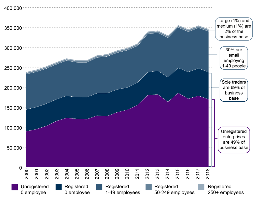 Unregistered enterprises are sole proprietorships and partnerships that are not large enough to be VAT registered and are not PAYE registered. These represent approximately one in two of every enterprise.