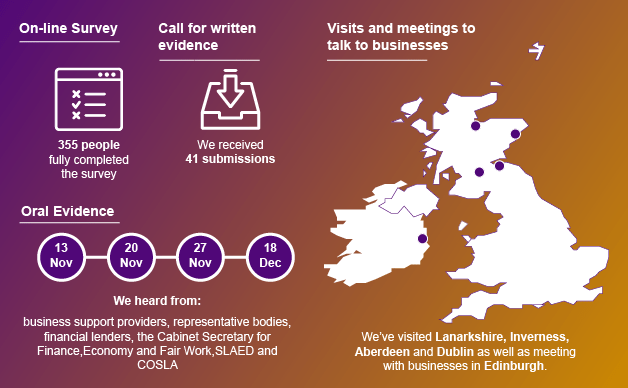 Committee members have undertaken visits and meetings to talk to businesses and gain insight into different business support models. We have visited Lanarkshire, Inverness, Aberdeen and Dublin as well as meeting with businesses in Edinburgh. We would like to thank all of these businesses and organisations for the welcome we received and for the valuable input they gave to our inquiry. We would also like to thank everyone who supported the inquiry by providing evidence or completing the survey.