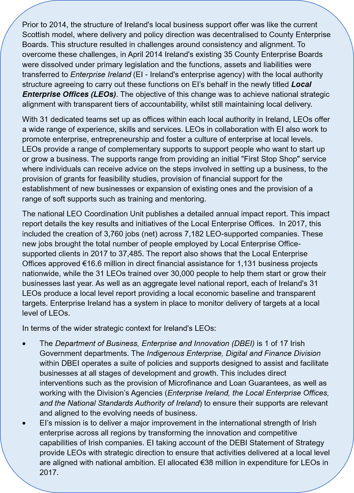 The Committee has already noted the lack of transparent accountability and alignment in the current Business Gateway structure. We note that the approach in Ireland provides a mix of tailored local delivery and national strategic direction, where Enterprise Ireland takes a strategic lead and holds local authorities accountable. The Irish model has evolved from a situation similar to the current Scottish context and appears to us on initial examination to deliver alignment and accountability.