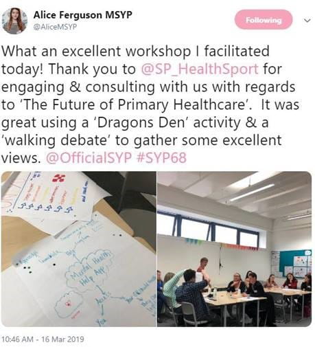 The Scottish Youth Parliament (SYP) worked with us to ensure we were able to access the views of younger people between 12 and 25. They distributed two of the questions from the survey (views on technology and which health professionals would they like to see), as part of a more comprehensive piece of work they were undertaking.