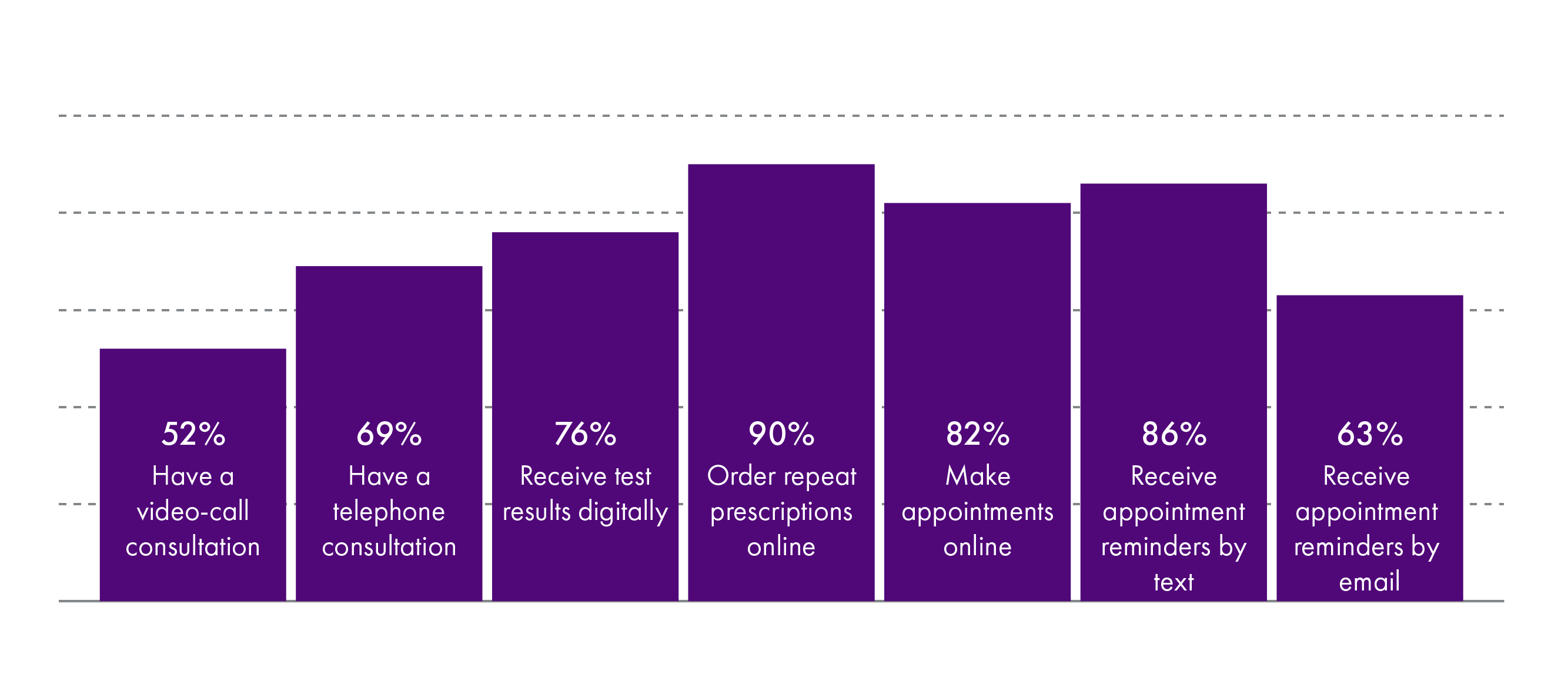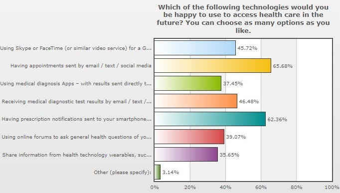 Up to 90% of survey respondents were happy to use technology to order repeat prescriptions with slightly less (82%) willing to make appointments on line, 86% would receive reminders by text and 63% by e-mail. 76% were happy to receive test results digitally, 69% to have a telephone conversation and just over half (52%) to have a video call consultation.