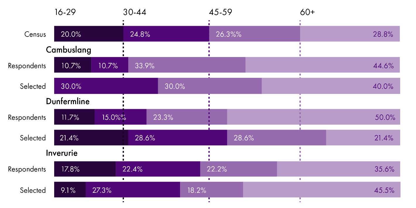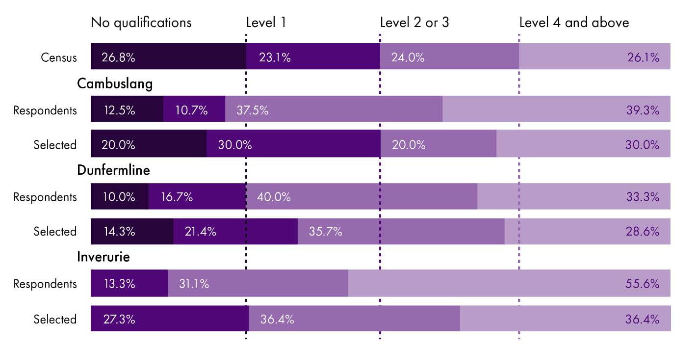Response rates were relatively low (from 1.8% for Inverurie to 2.4% for Dunfermline) which made it difficult to match the sample as closely as we would have liked to Scottish census data. For example, in Inverurie there were no respondents from the “no educational qualifications” category, while in Cambuslang no one was able to attend in the 16-29 category. Even so, the approach taken meant that we were able to include more young people, and people from a wider range of educational backgrounds.