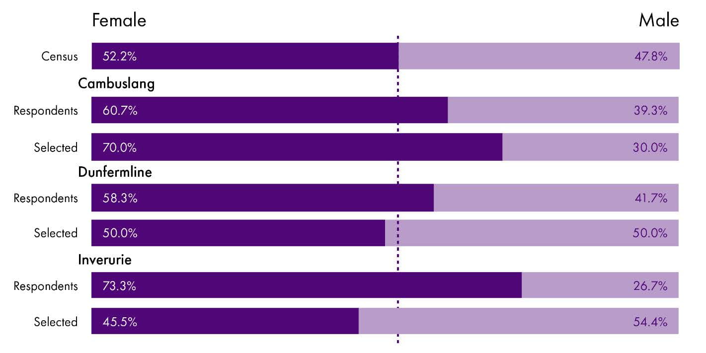 Parliament staff worked with a not-for-profit organisation, the Sortition Foundation, to recruit a randomly selected and stratified sample for each panel, based on 2011 Scottish Census data.