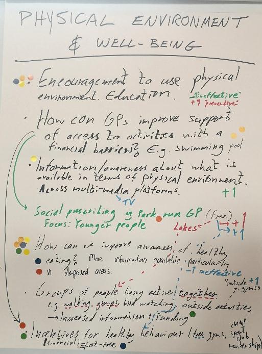 NB: Dots represent how the participants rated the ideas at the end of the day.Each had 10 sticky dots to place next to their top priorities across the themes.