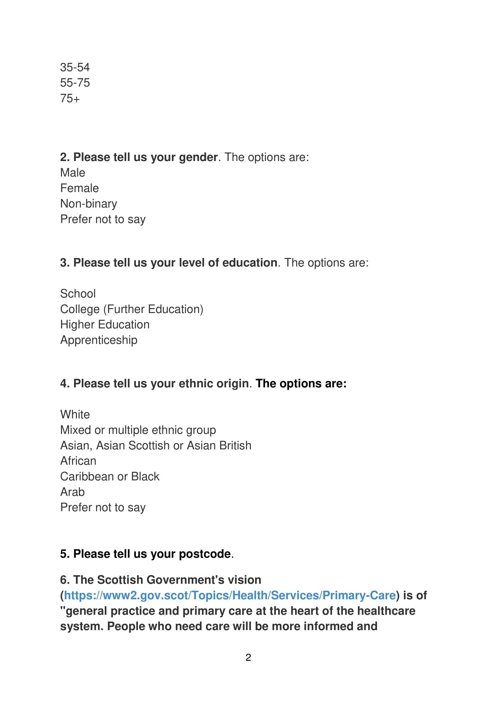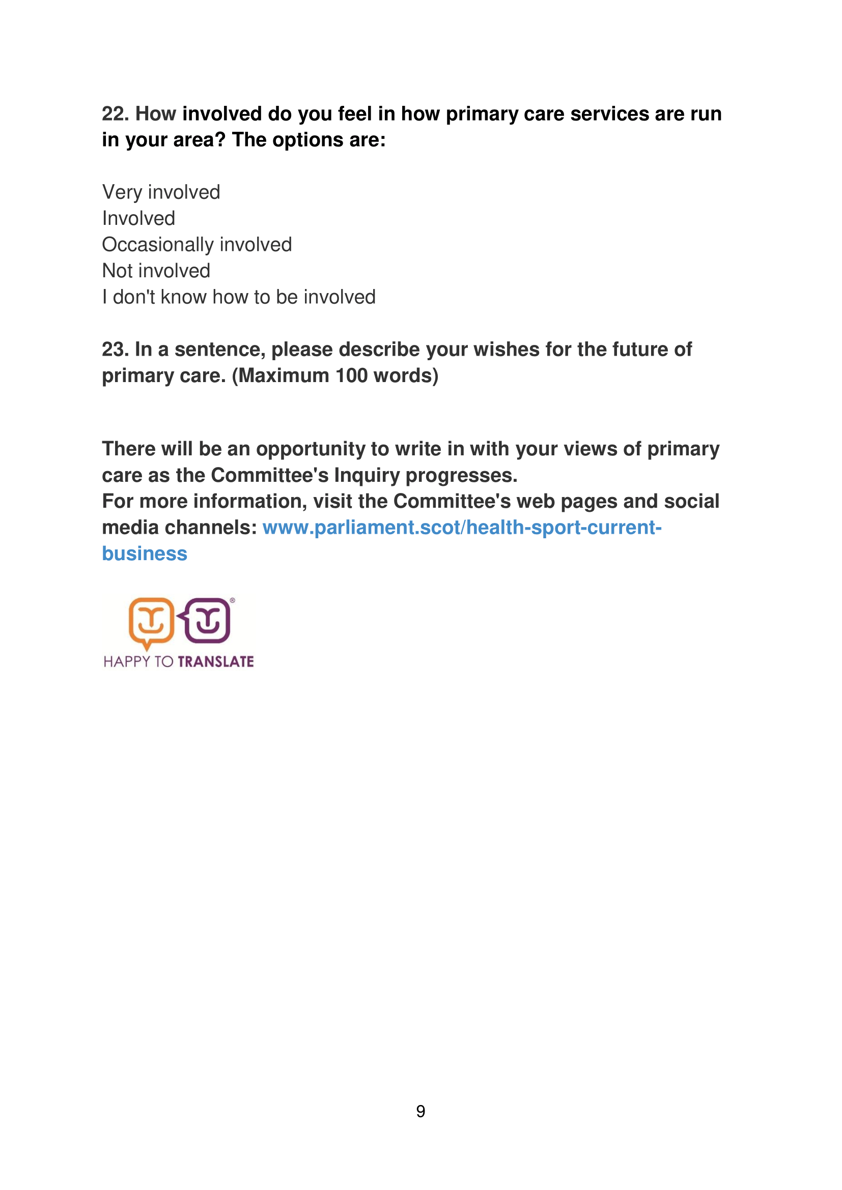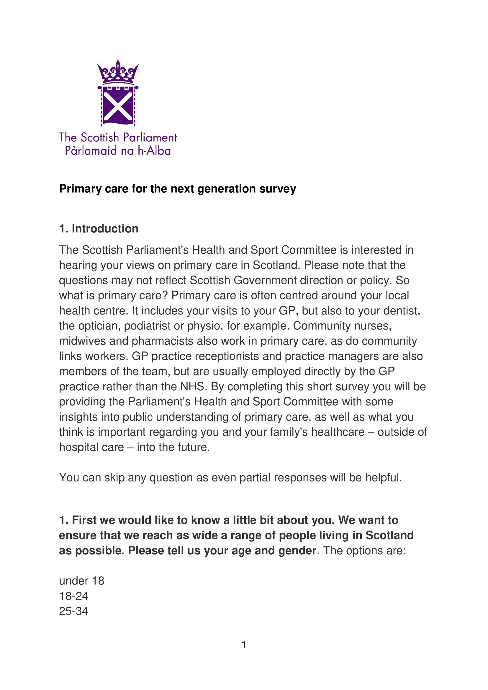 The Scottish Parliament's Health and Sport Committee is interested in hearing your views on primary care in Scotland. Please note that the questions may not reflect Scottish Government direction or policy. So what is primary care? Primary care is often centred around your local health centre. It includes your visits to your GP, but also to your dentist, the optician, podiatrist or physio, for example. Community nurses, midwives and pharmacists also work in primary care, as do community links workers. GP practice receptionists and practice managers are also members of the team, but are usually employed directly by the GP practice rather than the NHS. By completing this short survey you will be providing the Parliament's Health and Sport Committee with some insights into public understanding of primary care, as well as what you think is important regarding you and your family's healthcare - outside of hospital care - into the future. You can skip any question, but please click the 'submit' button at the end of the survey, as even partial responses will be helpful.