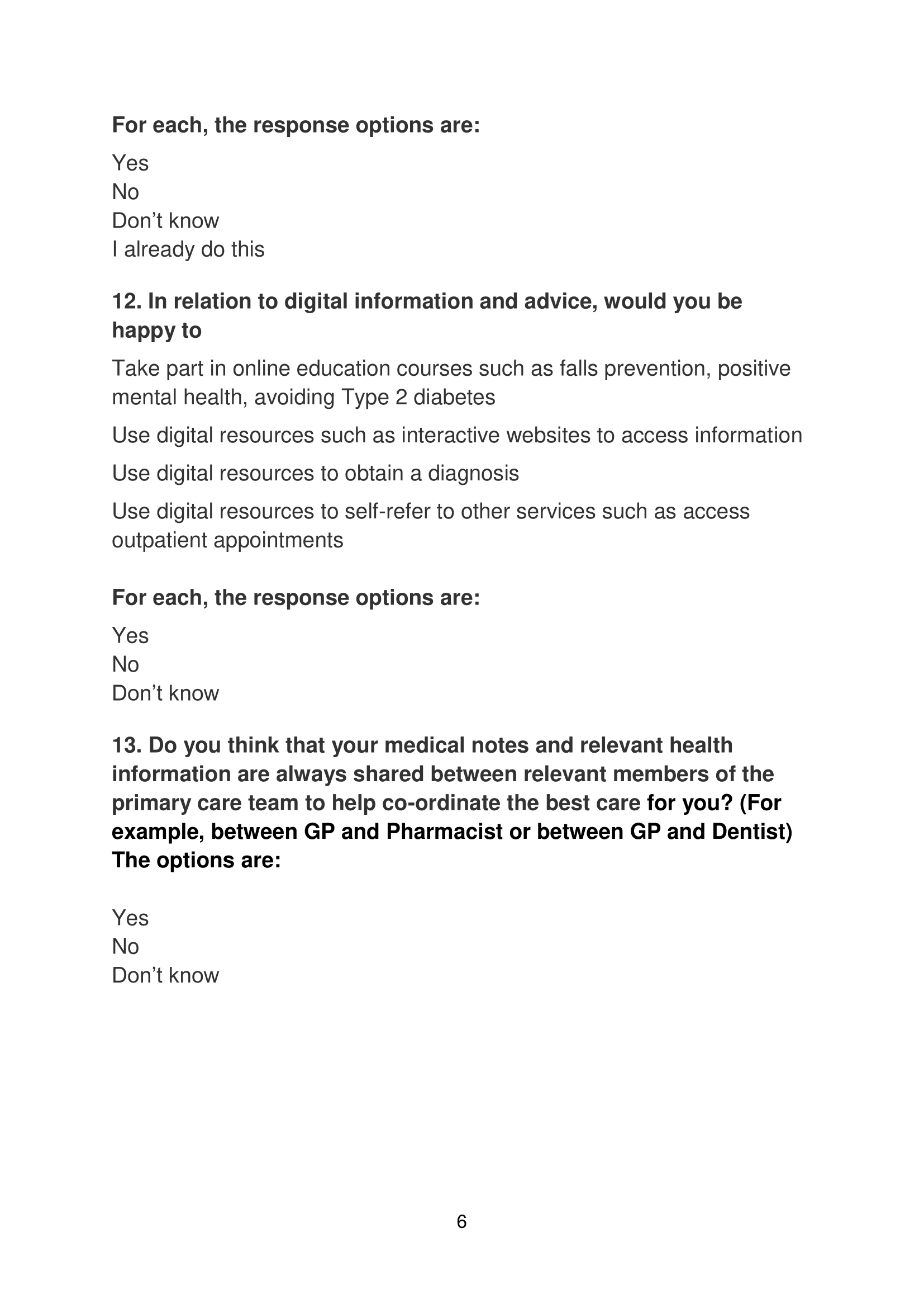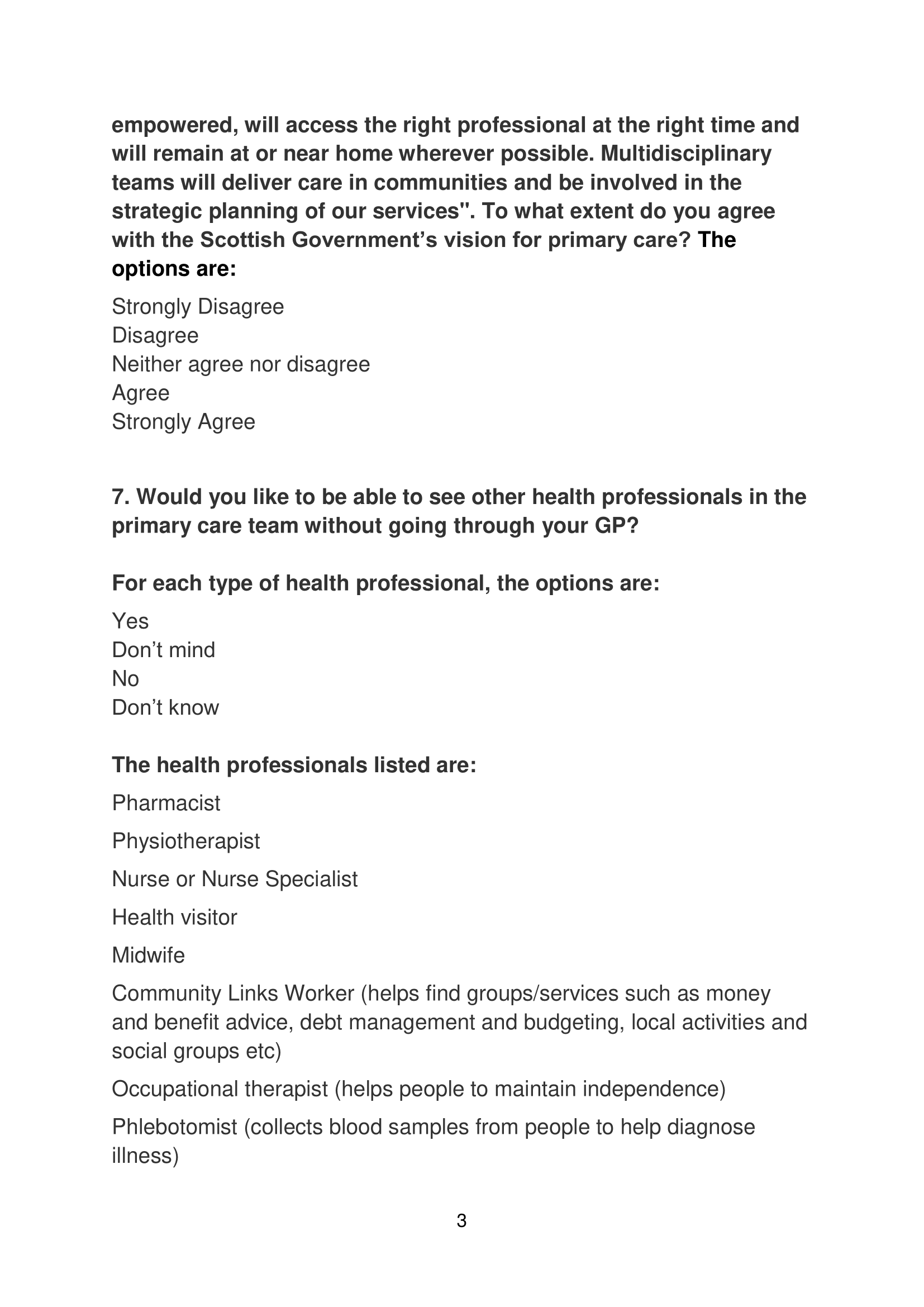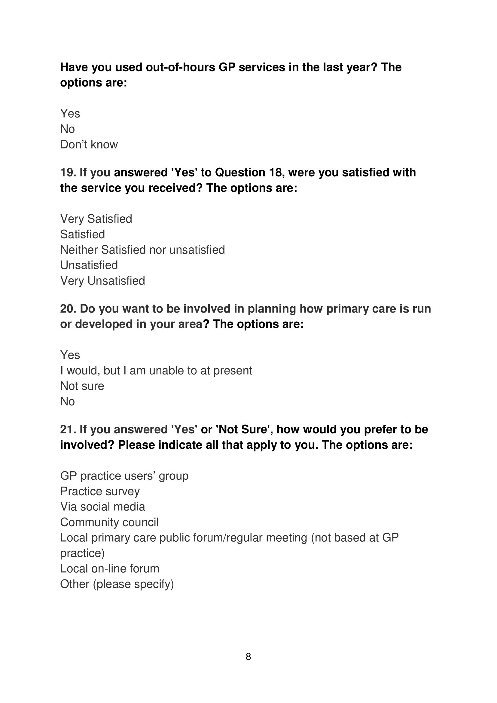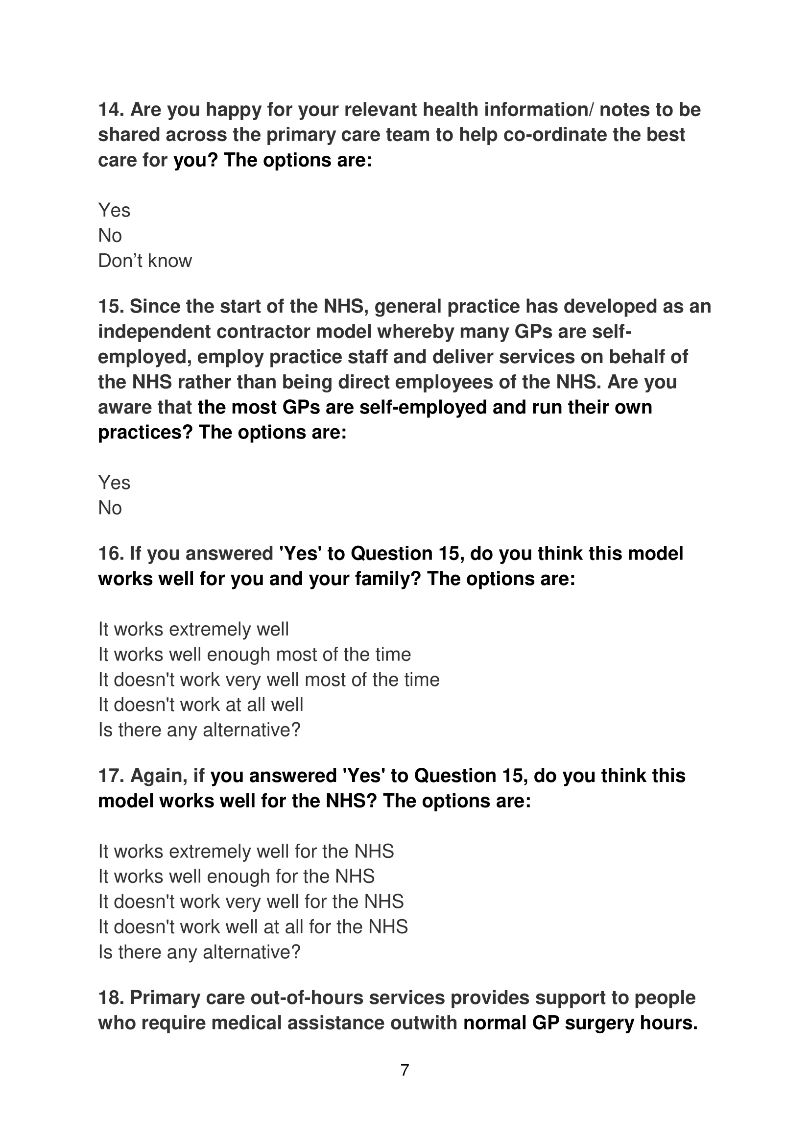 The survey questions comprised a range of mainly ‘closed’ questions on a range of topics relating to primary care. These topics included: