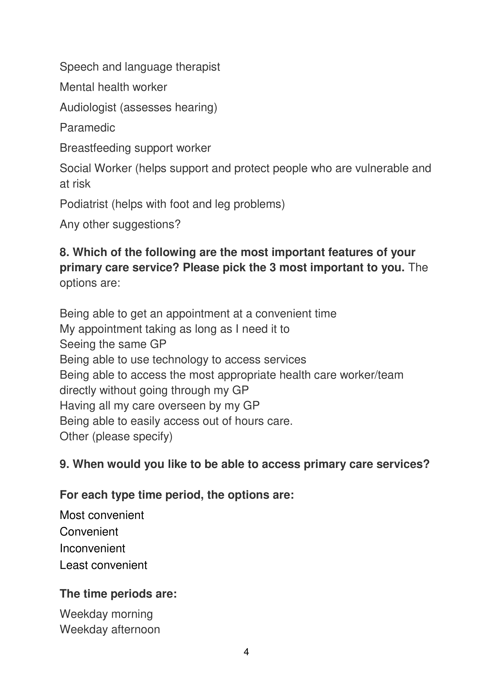 Priorities for people in their experience of primary care – access to appointments and services, length of appointment etc