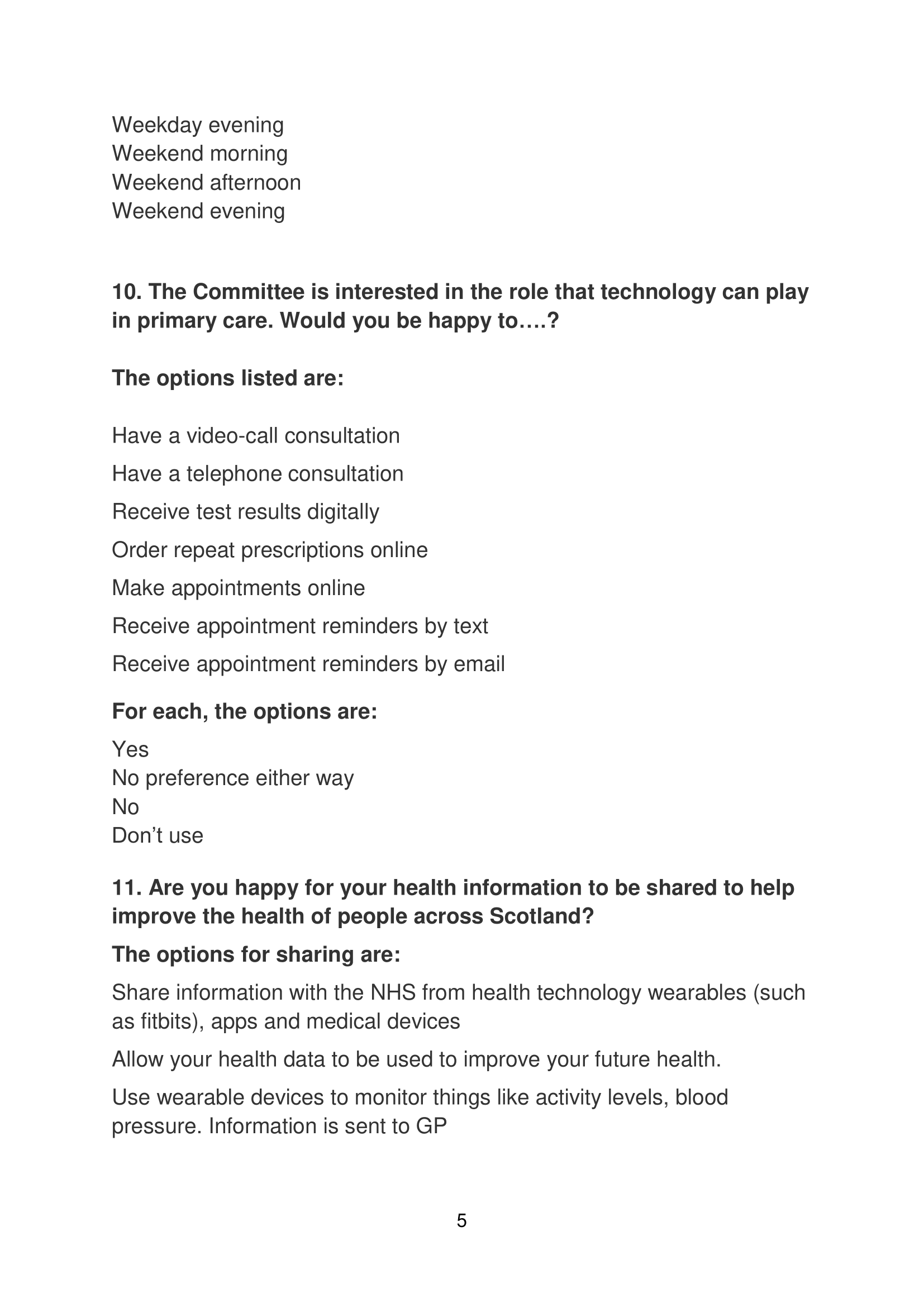 Responses from the SYP recommended the use of e-mail, text and social media for appointments and prescriptions. They also recommended the use of Skype or FaceTime appointments with GPs in particular for those in rural/remote areas and with disabilities. They welcomed a greater use of opt-in healthcare App’s including one for mental health but also expressed reservations about App’s for medical diagnosis being mandatory.