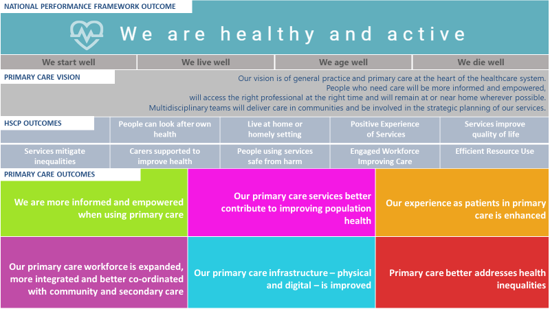 The Scottish Government’s National Clinical Strategy for Scotland signals the transformation required in Primary Care. “The strategy describes the rationale for an increased diversion of resources to primary and community care. Stronger primary care across Scotland should and will be delivered by increasingly multidisciplinary teams, with stronger integration (and where possible, co-location) with local authority (social) services, as well as independent and third sector providers”.