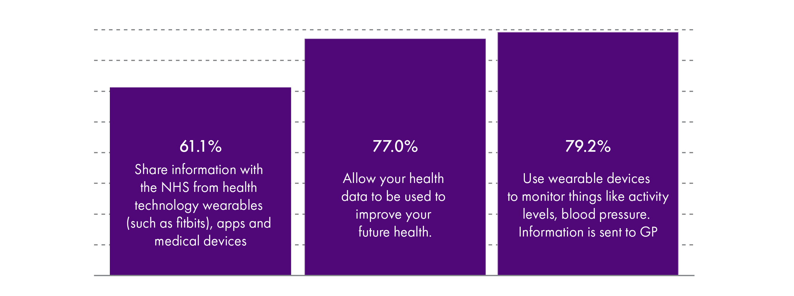 77% of survey responses were happy to allow their data to be shared, slightly more (79.2%) would use wearable devices to monitor activity levels and blood pressures and allow information to be transmitted direct to GPs with 86.2% were happy for their notes to be shared across the primary care team. Although the number willing to share such information with the NHS as an organisation was less at 61% .