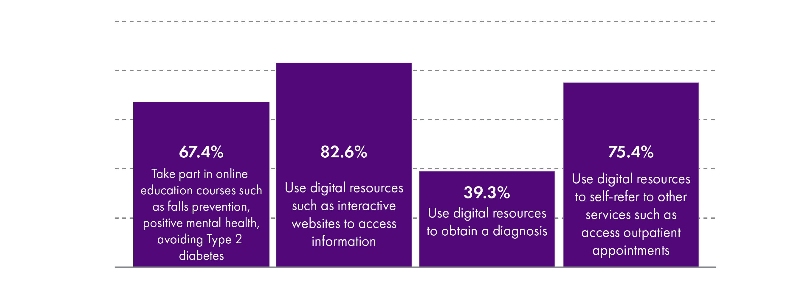 Over two thirds of survey respondents would be willing to take part in on-line health education, use digital resources to self-refer to other services such as outpatient appointments with over 82% content to use digital resources to access information. However fewer than 40% wished to use digital resources to obtain diagnosis.