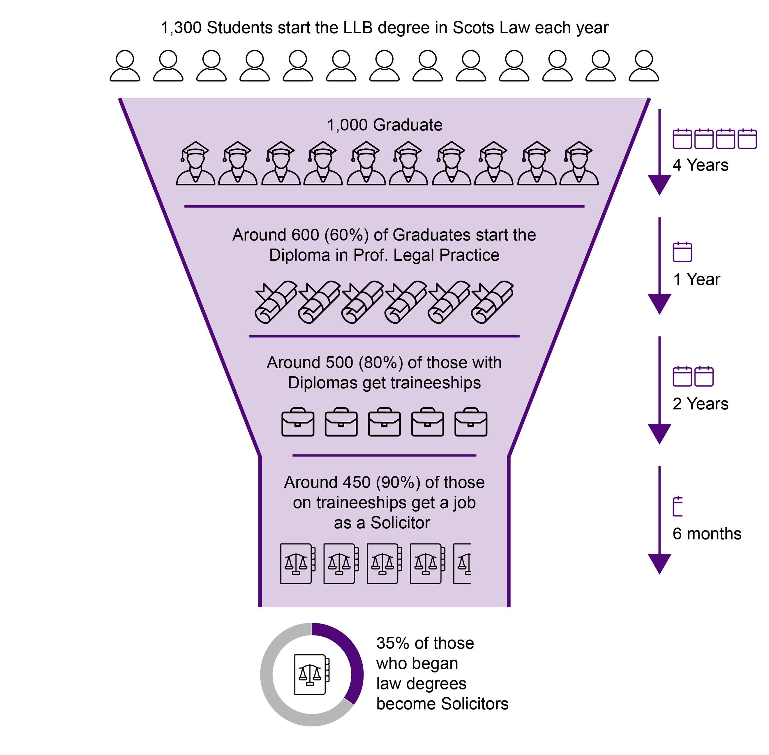 The standard route to qualify as a solicitor in Scotland, which is followed by the vast majority of people, is a linear one starting at university. It involves three consecutive stages:
