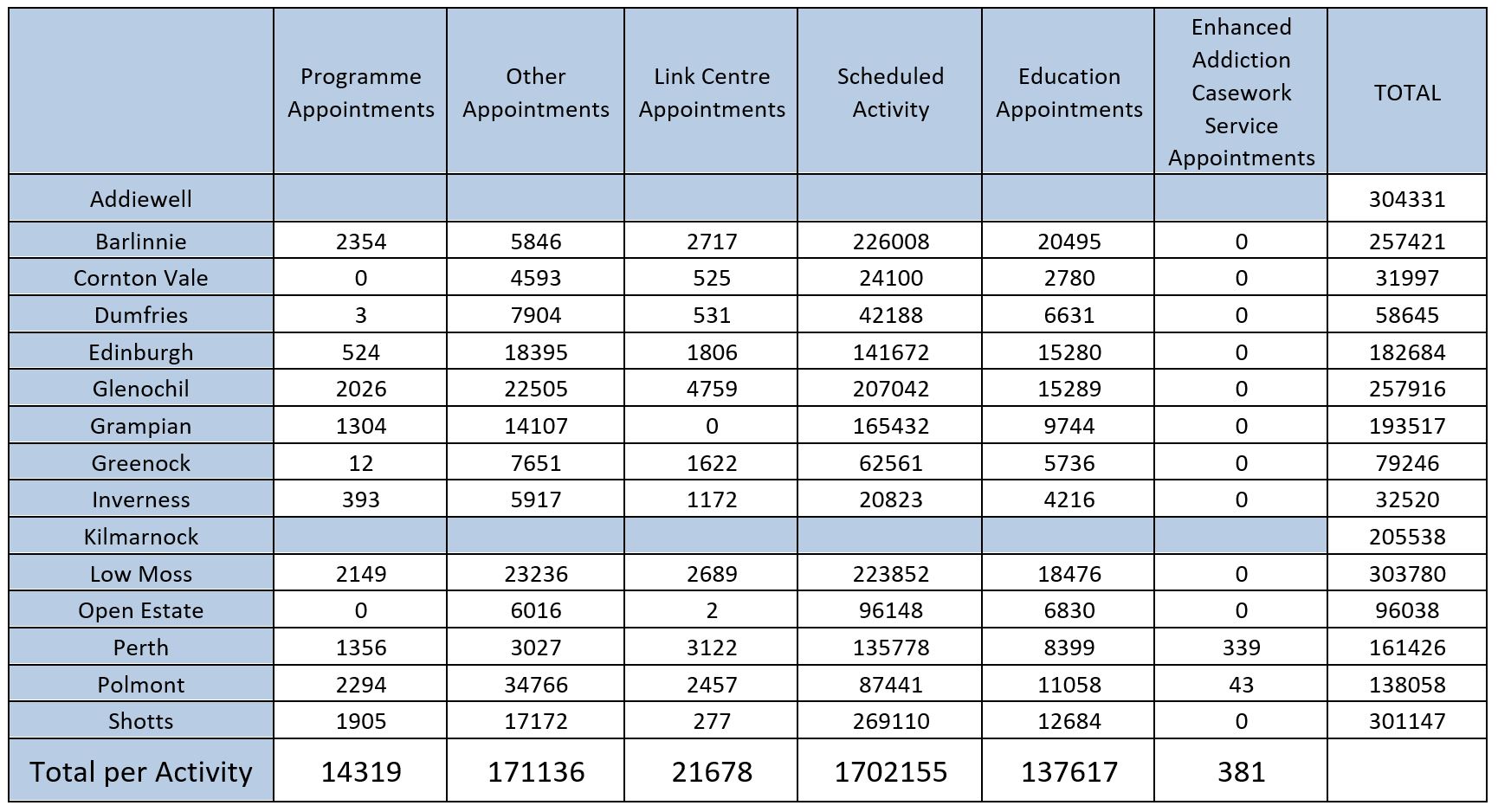 Further figures were provided by the Scottish Prison Service by prison and by type of purposeful activity; see Figure 1 below.