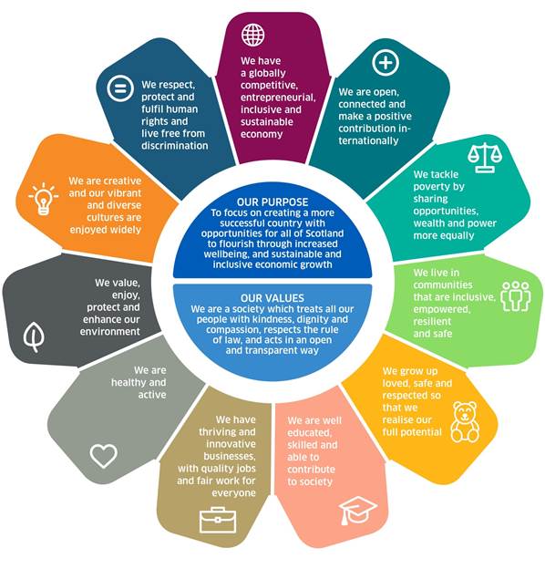 The Scottish Government's Purpose stated in the draft National Outcomes document is “to focus on creating a more successful country with opportunities for all of Scotland to flourish through increased wellbeing, and sustainable and inclusive economic growth”. This differs from the current Purpose in that the words “wellbeing” and “inclusive” have now been added.