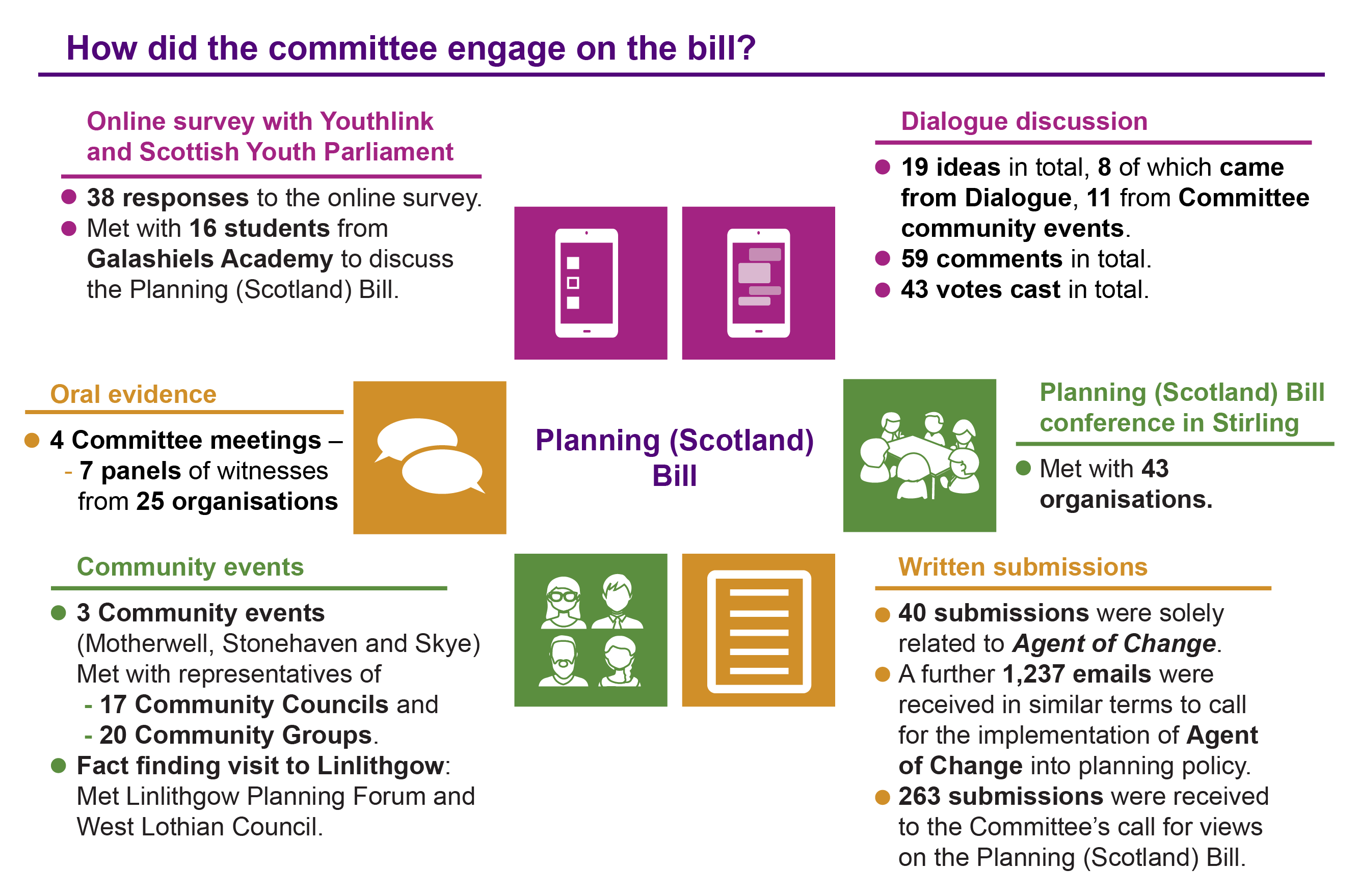 The Committee held events in Skye, Stonehaven and Motherwell on Monday 5 February 2018 to discuss the Planning (Scotland) Bill with Community Councils and community groups. Summary notes from each of the community events are available online at: http://www.parliament.scot/parliamentarybusiness/CurrentCommittees/107202.aspx
