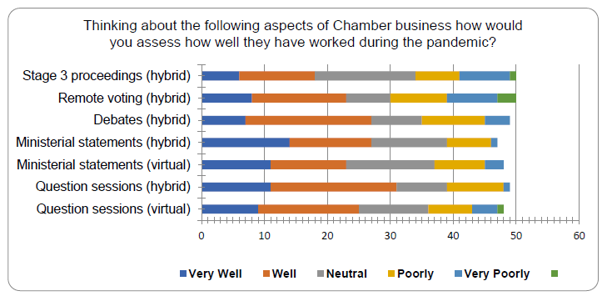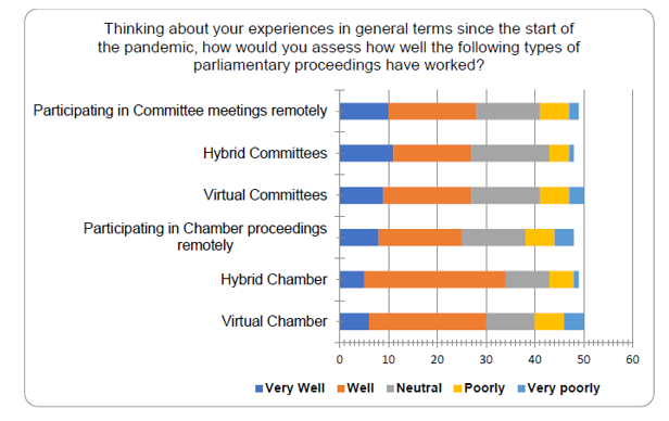 1. The survey indicated that MSPs' experience was mixed, with differing assessments from Members. Around 50-60% of the MSPs who responded considered that the arrangements had worked well or very well for various forms of parliamentary proceedings, while a significant minority of 10-20% considered that the arrangements had worked poorly or very poorly.