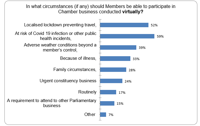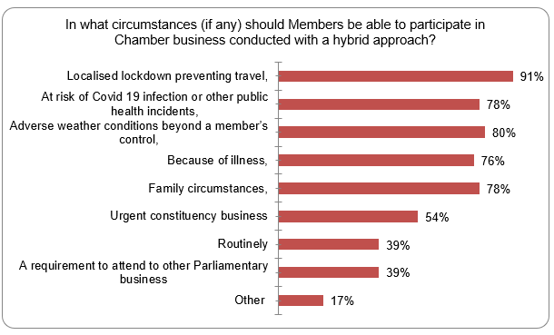 1. Over the autumn of 2021, Chamber and committee business was largely maintained in its pre-pandemic pattern, albeit with business taking place in either a fully virtual or a hybrid format. The evidence submitted by the SPCB included a survey of Members undertaken in September and October 2021 on their views on the new ways in which parliamentary business was taking place. 51 MSPs - approximately 40% of all MSPs - responded to the survey.