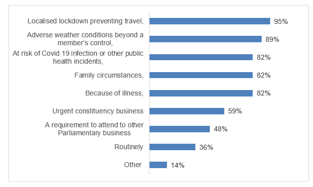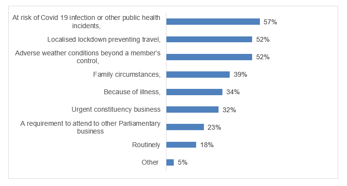 1. Proxy voting has been used in a number of legislatures, particularly to assist elected members who are unable to attend the plenary chambers. Dr Hannah White told the Committee that the UK Government had initially proposed that the pairing system be used in the House of Commons, but this was rejected by MPs as unsatisfactory. In-person voting then became untenable for health and safety reasons due to the queuing involved. The UK Government therefore introduced a proxy-voting system, initially only for those who could not vote for health reasons, but which was later extended. By January 2021, 580 out of a total of 639 MPs who take part in divisions did so by means of a proxy. The Government Deputy Chief Whip held more than 300 proxy votes and his Opposition equivalent held more than 170 votes.i In relation to the initial move to proxy voting, Dr Hannah White observed: