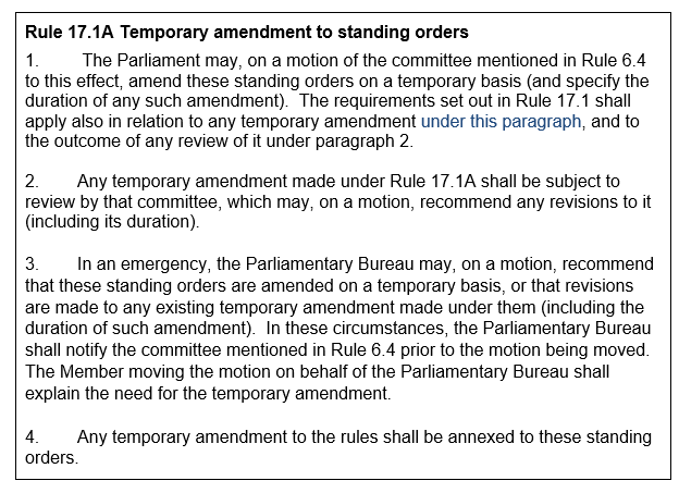 1. The Parliament may, on a motion of the committee mentioned in Rule 6.4 to this effect, amend these standing orders on a temporary basis (and specify the duration of any such amendment). The requirements set out in Rule 17.1 shall apply also in relation to any temporary amendment under this paragraph, and to the outcome of any review of it under paragraph 2.