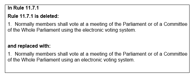 1. Normally members shall vote at a meeting of the Parliament or of a Committee of the Whole Parliament using the electronic voting system.