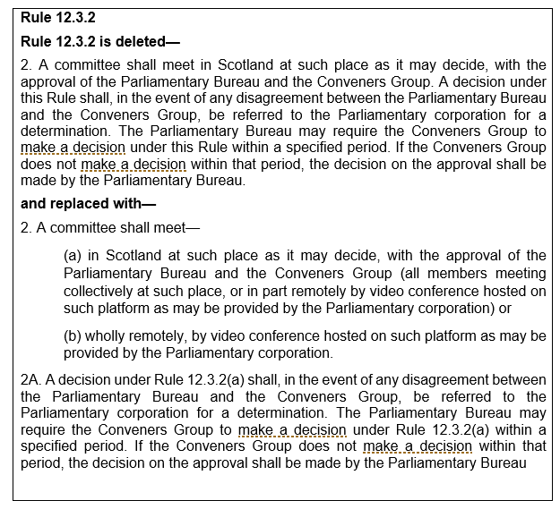 1. The Committee recommends that Rule 12.3.2 be permanently changed to provide for hybrid and virtual meetings of committees. In light of the concerns expressed by the Conveners Group and some individual members, the Committee suggests that the Session 6 Parliament may wish to review this rule change when committees are able to meet fully again in a physical capacity.