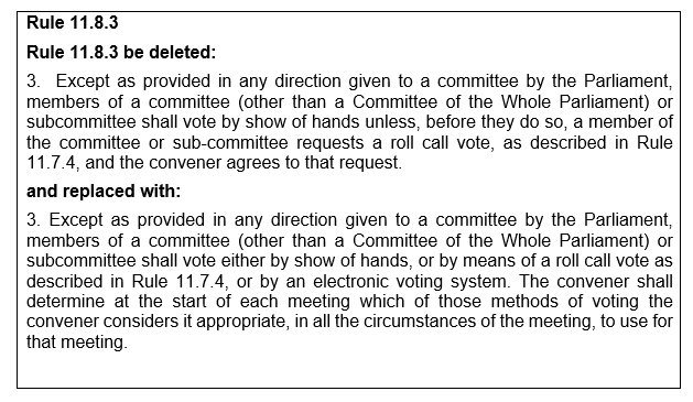 1. For the duration of the Covid-19 pandemic, Rule 11.8.3 has been varied to enable committees to vote in a number of different ways (show of hands, roll call or electronic voting). This variation has been particularly valuable to committees in considering amendments at Stage 2.