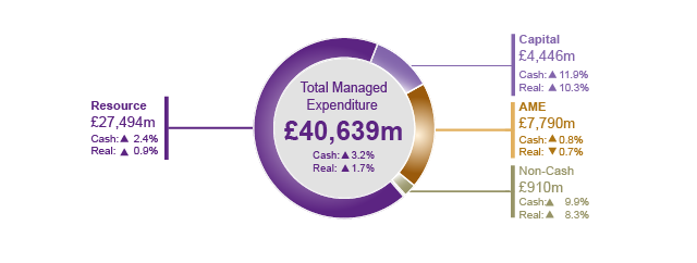 Total Managed Expenditure (TME) comprises Fiscal Resource, non-cash Resource, Capital and Annually Managed Expenditure (AME). TME in 2018-19 is £40,639m. Figure 2 shows how this is allocated. Fiscal Resource (which covers day-to-day expenditure) and Capital (covering infrastructure spending) are the the elements of the budget over which the Scottish Government has discretion. AME is expenditure which is difficult to predict precisely, but where there is a commitment to spend or pay a charge, for example, pensions. Pensions in AME are fully funded by HM Treasury, so do not impact on the Scottish Government's spending power. Non-domestic rates are also classed as an AME item in the budget and form part of Local Government spending.