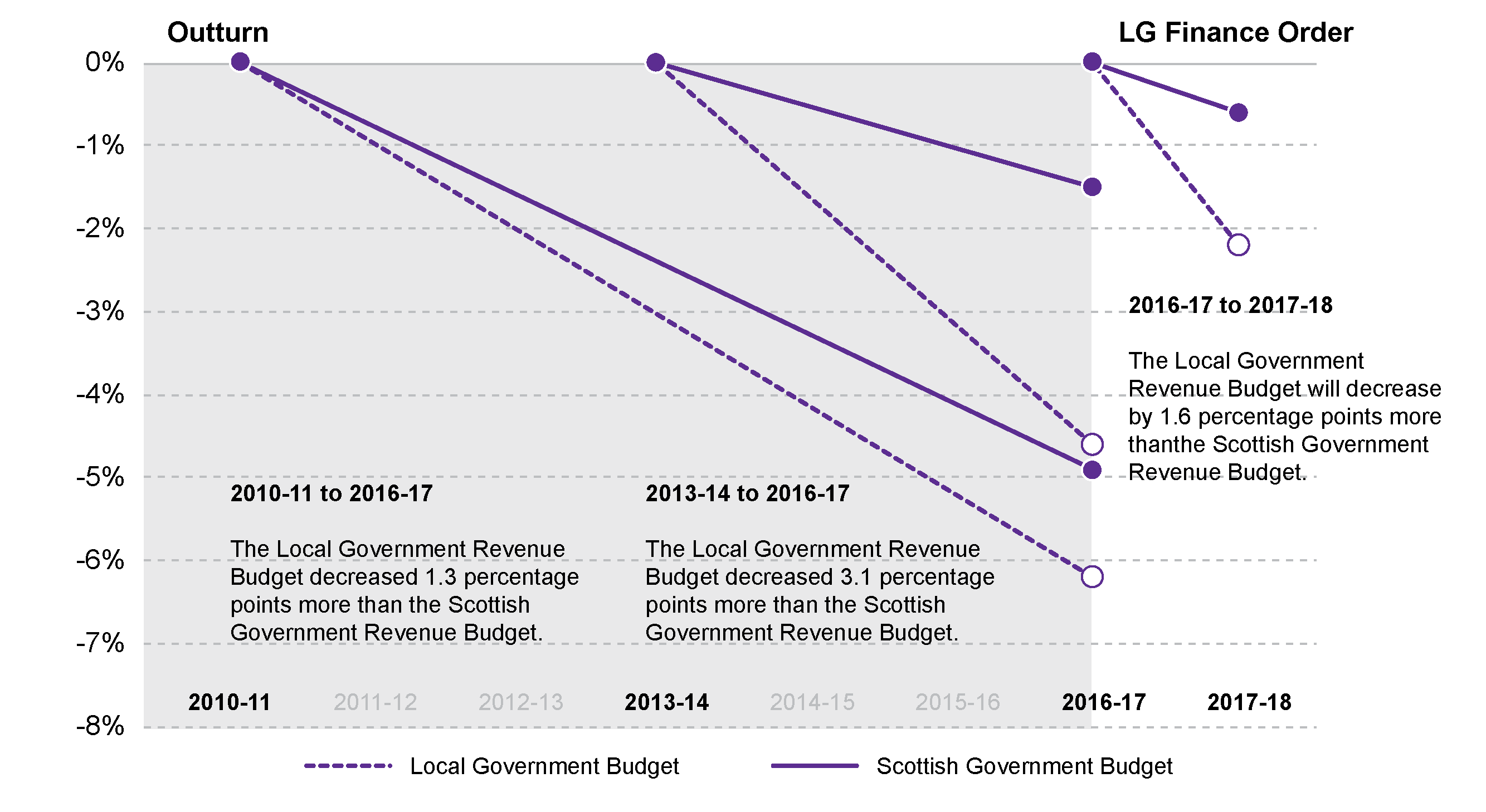 Real terms change figures show that, over 2010-11 to 2016-17, if the spend on police and fire in the years up to 2012-13 is adjusted out, then the local government revenue budget decreased only slightly faster (-6.2%) than the Scottish Government budget (-4.9%).