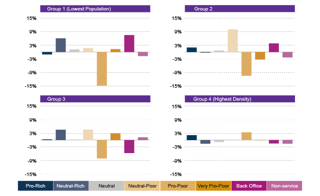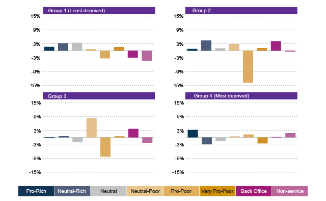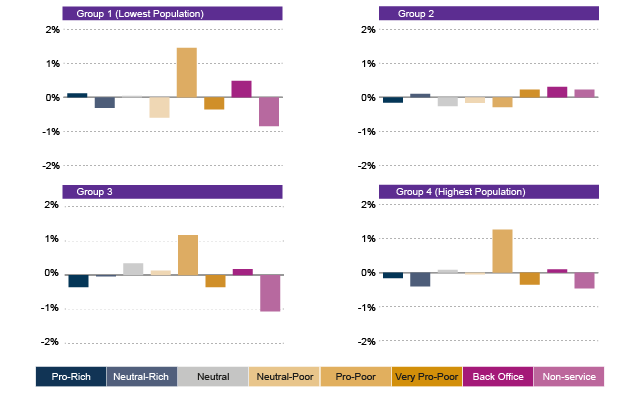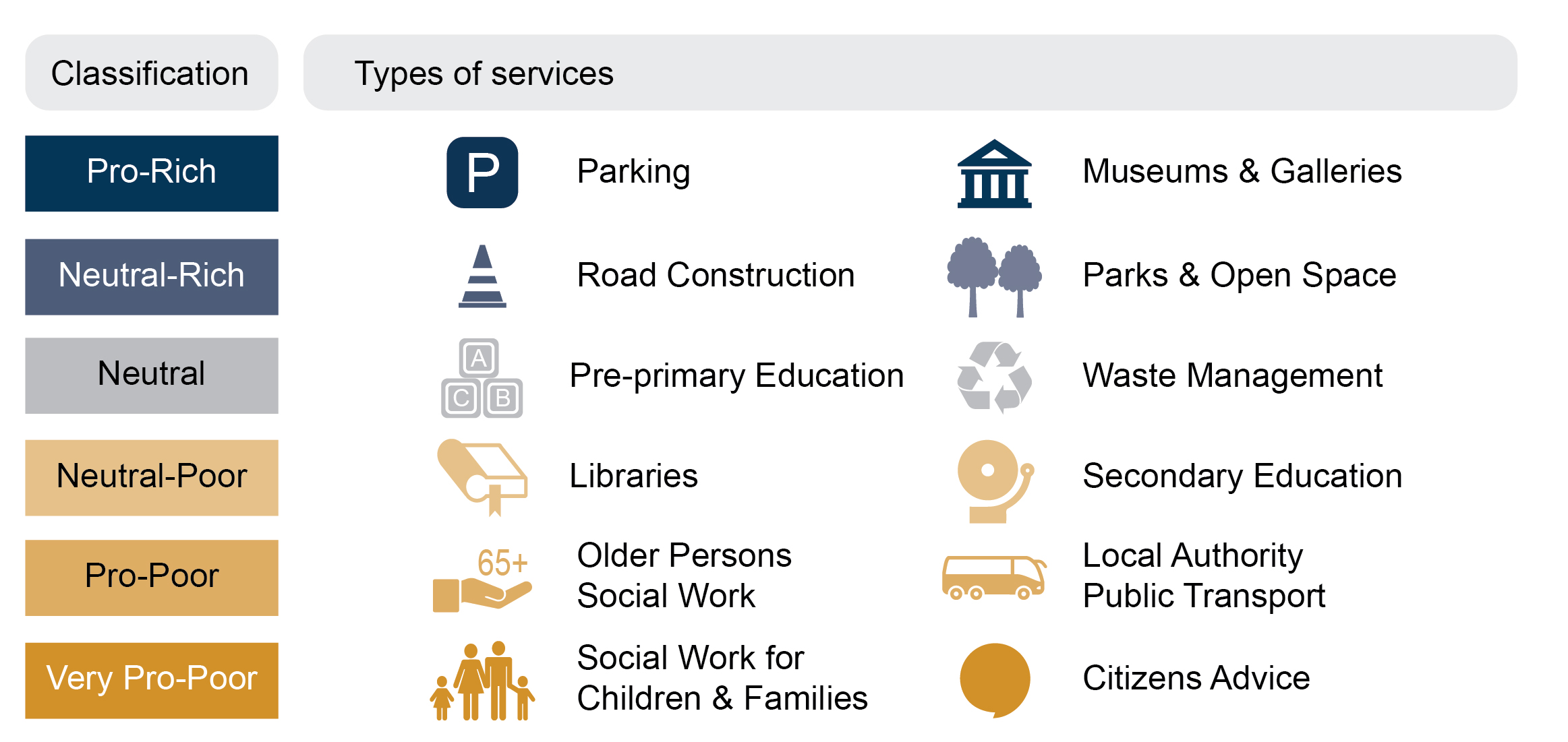 Pro-Poor services are used more by poorer groups. Includes older persons’ social work and local authority-run public transport.