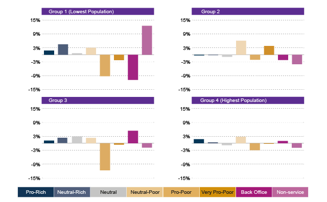 When we group councils by size, it is evident that the biggest councils are in fact making the largest proportion of their savings from Neutral services (20% compared with only 17% of savings coming from Pro-Poor services)