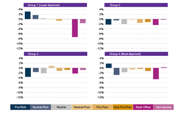 When compared to the 2016-17 savings, the rate of savings from Pro-Rich services has remained relatively stable while the rate of savings from Neutral, Pro-Poor and Very Pro-Poor services have decreased. This could be interpreted as a move to protect both services used by all residents equally as well as those relied upon by the most vulnerable. It should be borne in mind however that the magnitude of change is small and that trends over 2 years of data should be treated with caution. The biggest change is in back office where the savings rate has fallen by 4% points.
