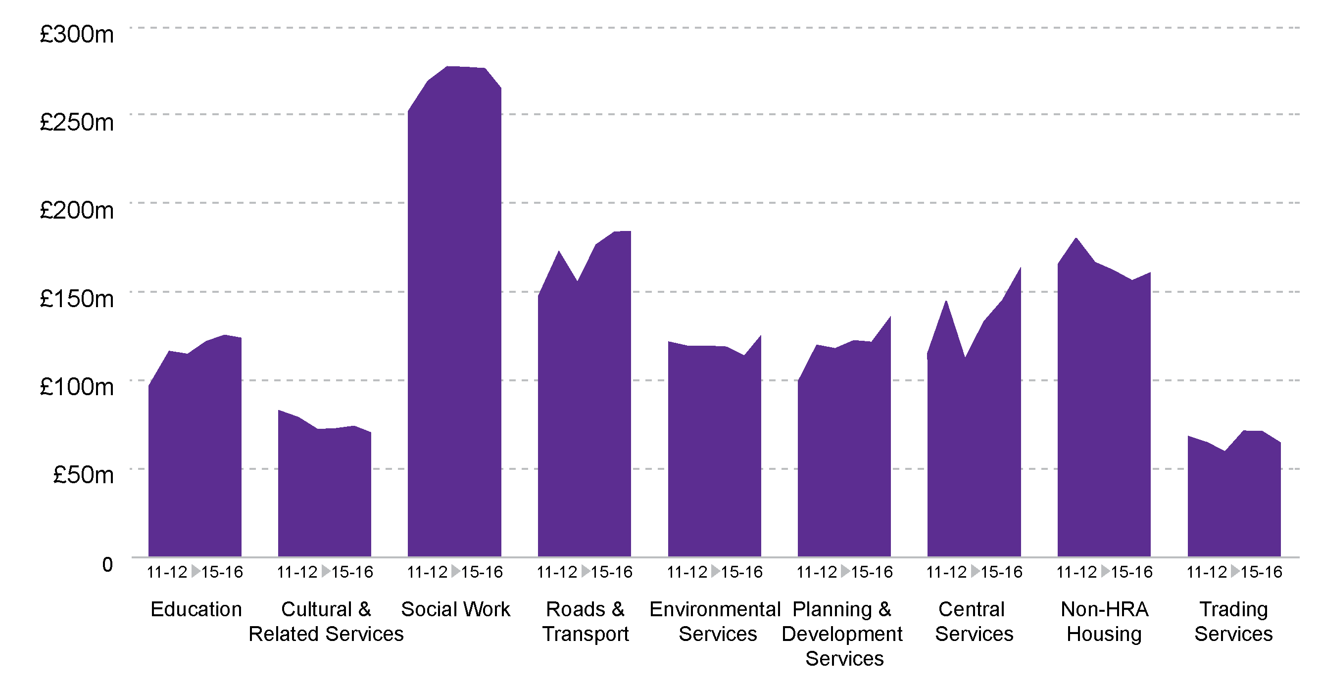 Since 2010-11, the major change has been the transfer of responsibility (and the associated funding of £1,583.3 million) for police and fire from local government to the new centralised police and fire services in 2013-14.