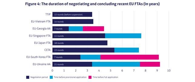The Institute for Government has charted the time taken to negotiate and conclude other recent international agreements between the EU and other countries and regions.
