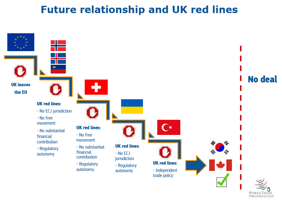 The EU and UK Government's negotiating red lines served to place limits on the depth of any future relationship at an early stage. For example, the future relationship will be largely dictated by the UK Government's stated red lines including ending freedom of movement and the jurisdiction of the European Court of Justice. This was illustrated in a slide published by the European Commission's Article 50 Taskforce in February 2018.