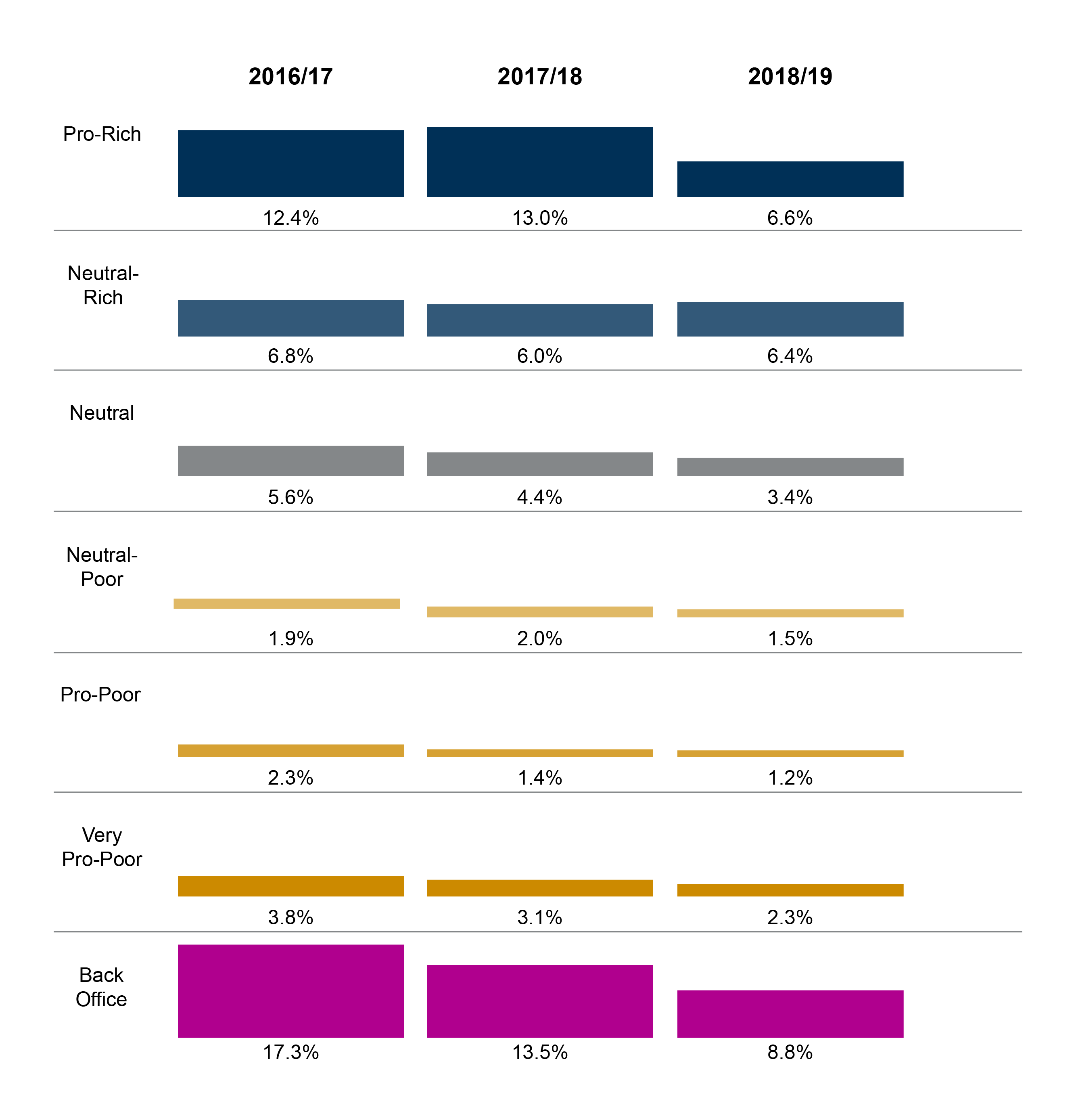 There has been very little change in expenditure patterns between 2016-17 and 2018-19. There was a minor increase in expenditure on Pro-Poor services (up by 1 percentage points).