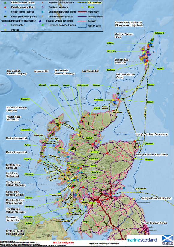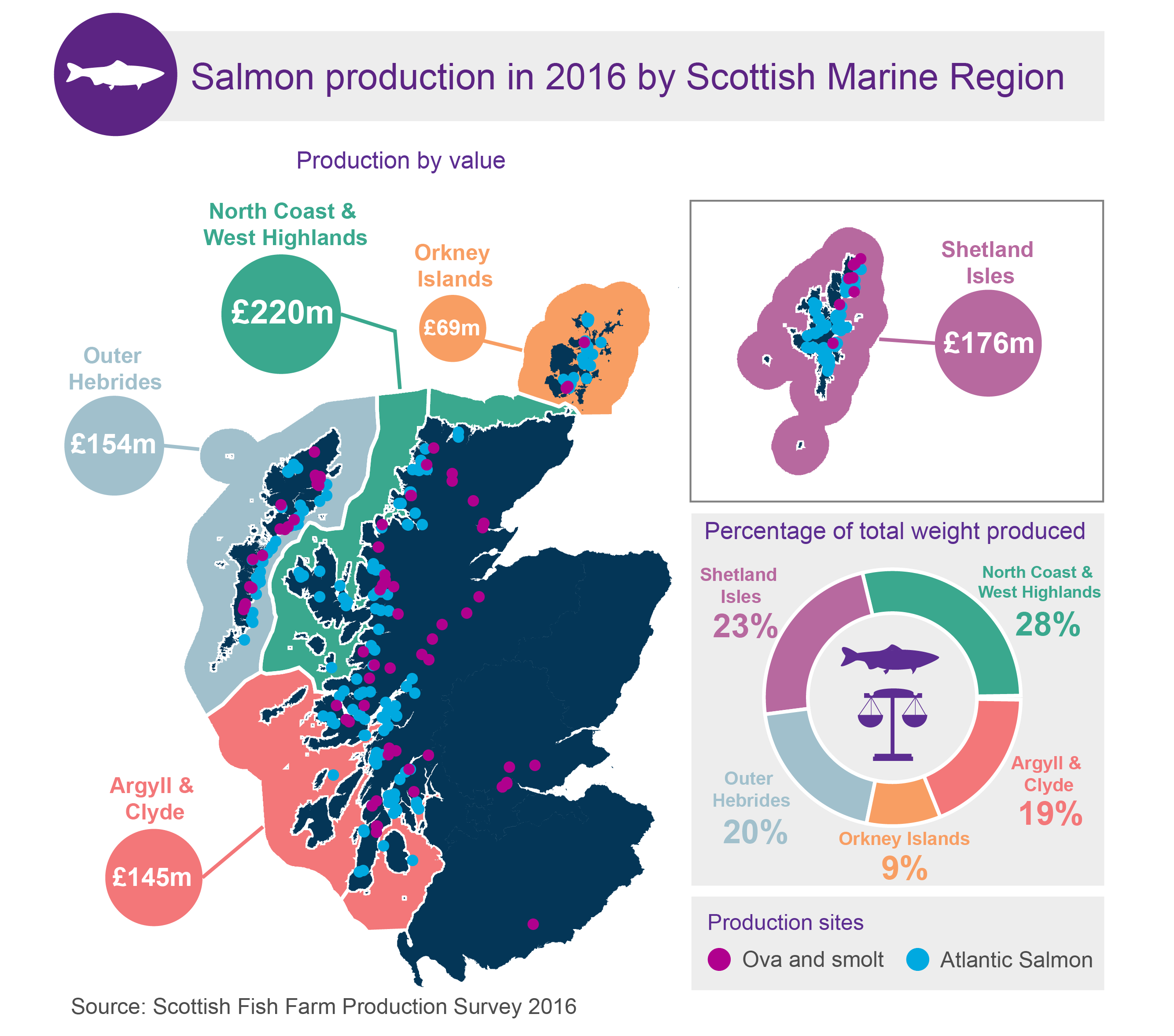 The Aquaculture infrastructure map of Scotland1 shows that salmon farming supply chain activities (e.g. smolt production, ports, harvesting and processing plants etc) take place throughout Scotland.