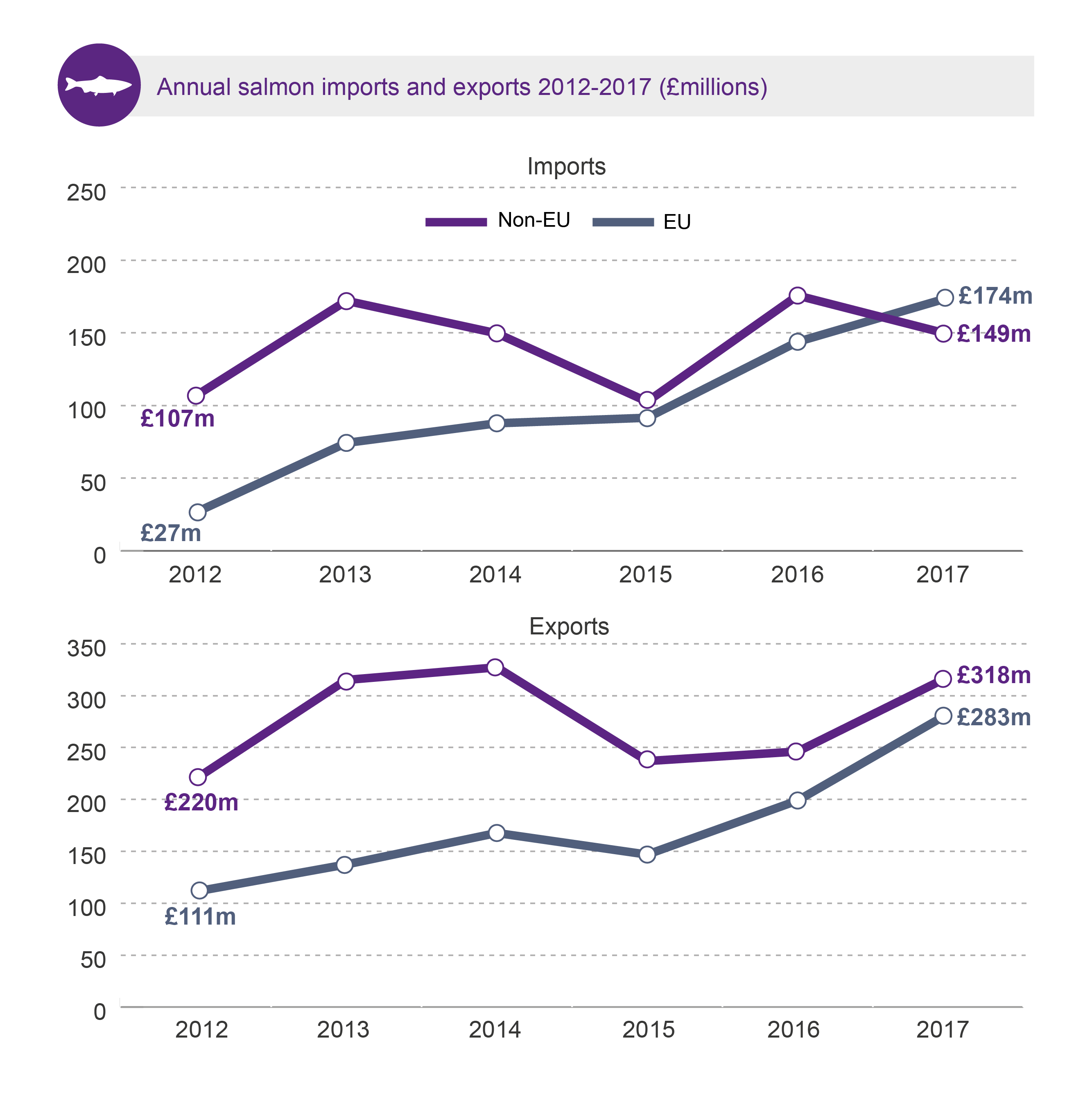 The UK also imports salmon. In 2017 the UK imported around £323 million of Atlantic salmon from EU and Non EU countries - the majority from Norway.