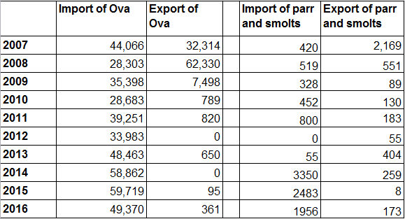 Scotland also imports and exports ova, parr and smolts as part of the farmed salmon production process. The number of ova laid down to hatch in 2016 was 64.3 million, the majority (90.8%) were derived from foreign sources (Scottish Fish Farm Production Survey 2016).