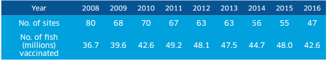 The majority of farmed fish are vaccinated against furunculosis and IPN, with smaller numbers of fish being vaccinated against ERM, vibriosis and SAV. In 2016 a total of 42.6 million fish were vaccinated across 47 sites. The table below shows vaccinations since 2008.