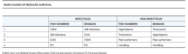 Marine Harvest (2017) provide information on causes of reduced survival in their farms. Marine Harvest also publish sea lice and mortality information on a site by site basis, showing the cause of "incident based mortality".