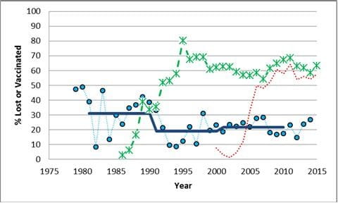 The figure below shows preliminary analysis of the history of losses 1979-2014 (blue circles) with decadal averages (dark blue line), vaccination uptake (green stars) for all vaccines and vaccination specifically for infectious pancreatic necrosis virus (red line), carried out by Marine Scotland (pers comm). The figure above shows that in the 1980s the average losses were 30%. This reduced to 20% in the 1990s, and increased slightly (but not statistically significantly) in the 2000's.