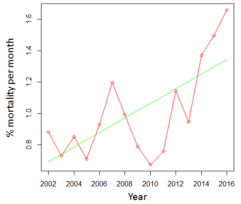 Scotlands' Aquaculture website provides Monthly Biomass & Treatment Reports for all fish farms, including a figure for kilograms of biomass lost per month. This shows that mortality was fairly flat at about 1% per month until 2010 and began to increase thereafter. A 1% mortality per month is equivalent to just under 20% mortality over an 18 month production cycle.